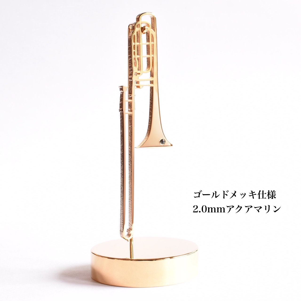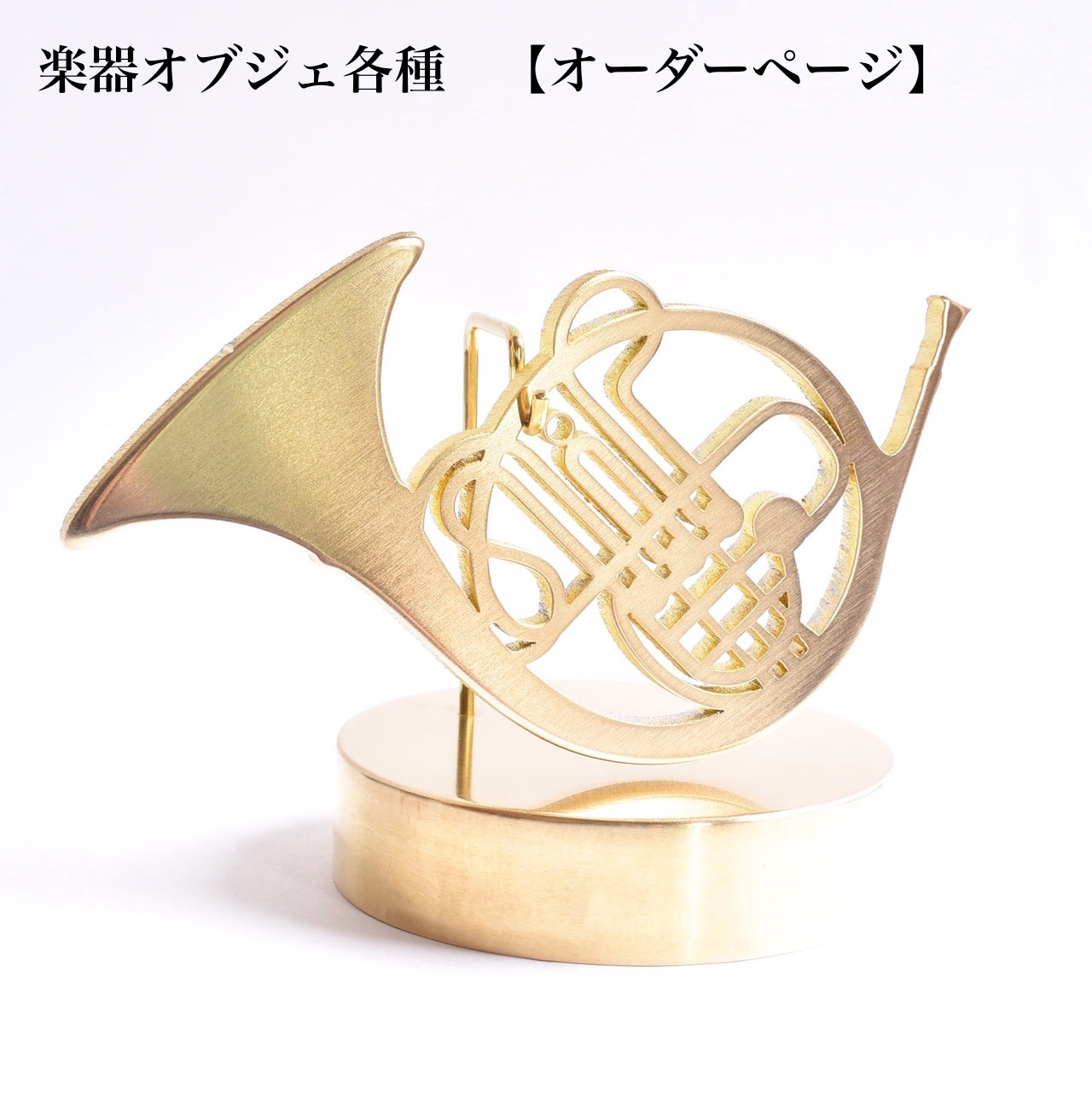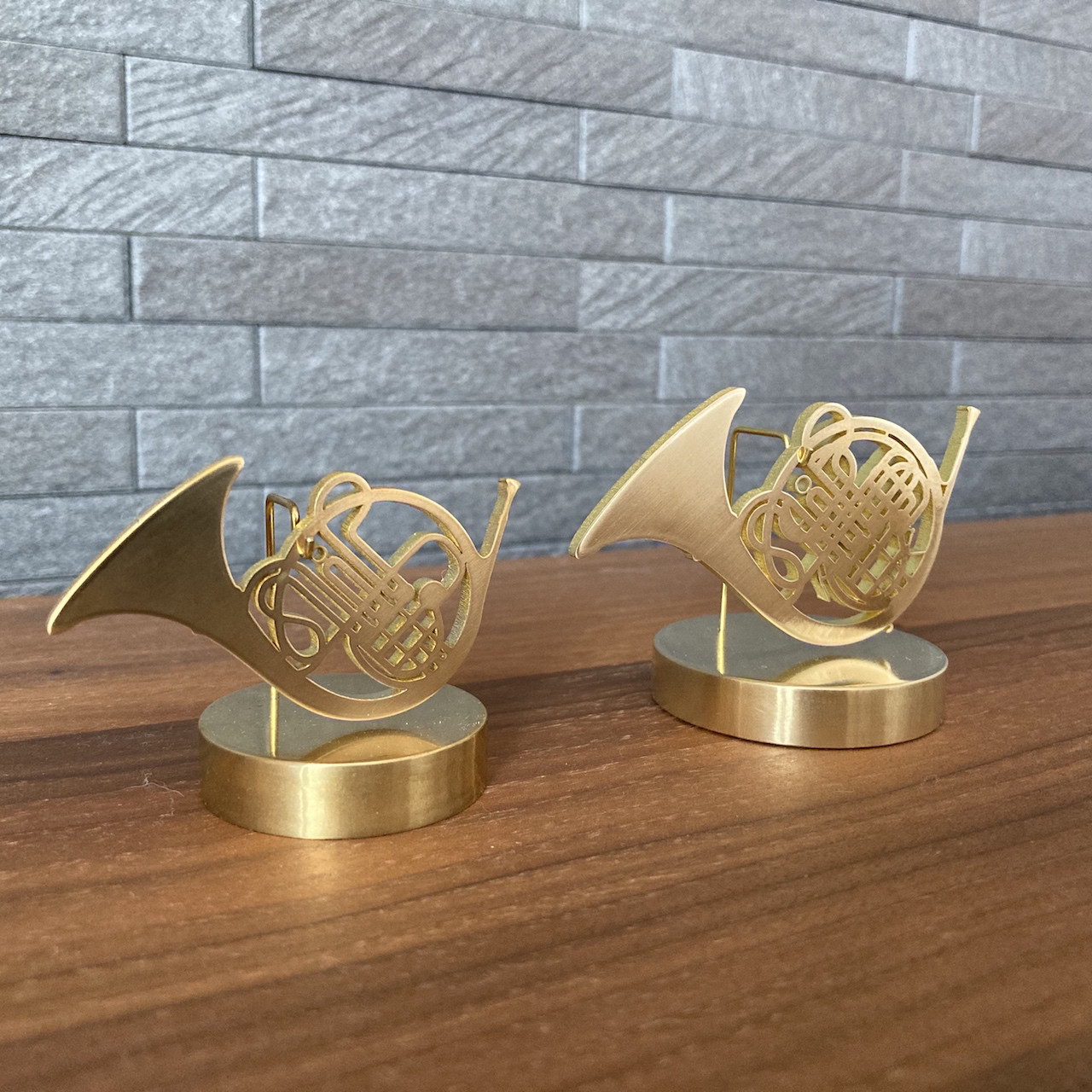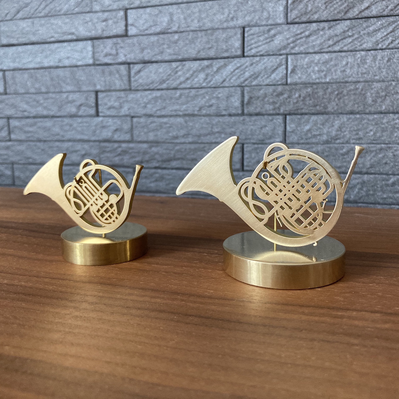 3mm厚の真鍮板の切り抜きによって楽器の機能美を表現したオブジェです。直径4cmの土台にハンギングして固定しており、もっとも美しいバランスで自立しております。手の平にちょこんと乗るサイズ感で、結婚式や記念日のギフトとしても人気の商品です。箱だしの綺麗な状態も良いですが、経年変化で渋くなった色合いも美しく、真鍮の風合いを楽しみながら長くご愛用頂ける商品となります。