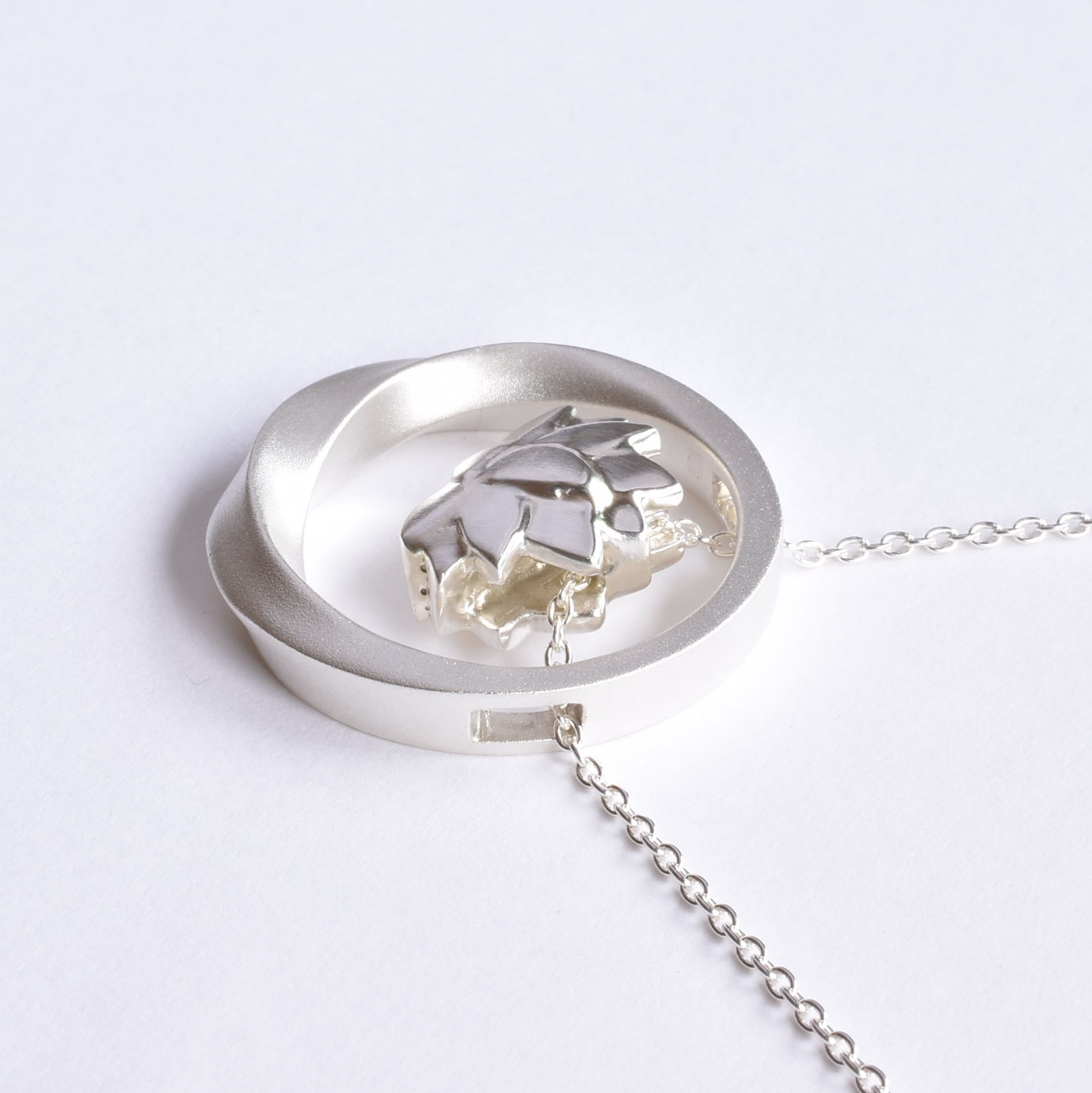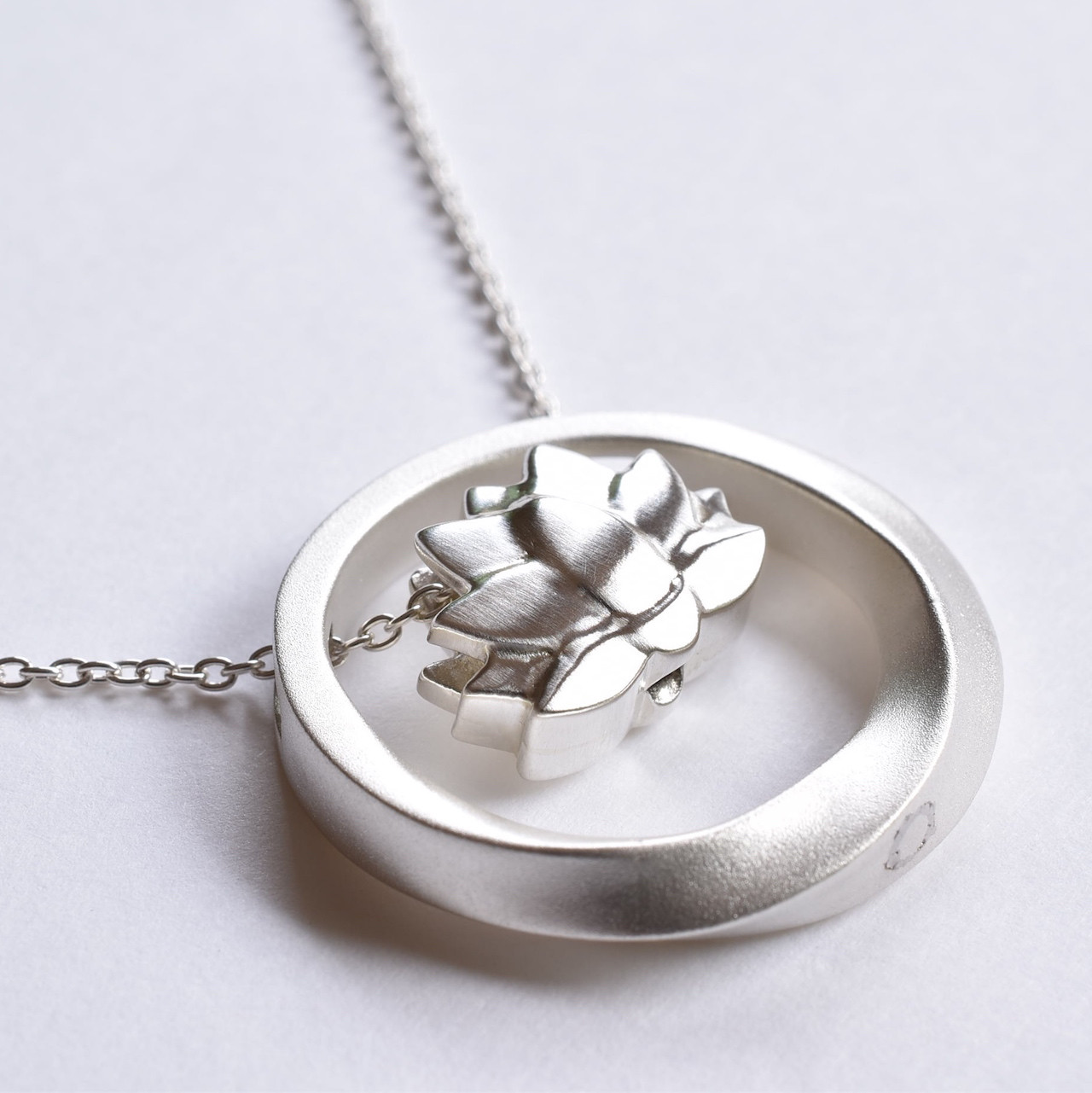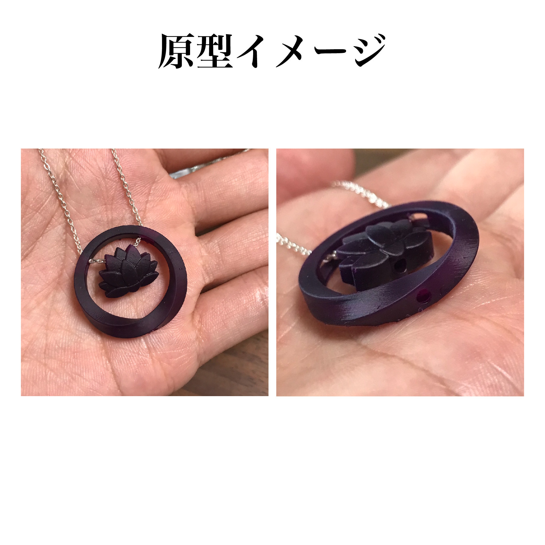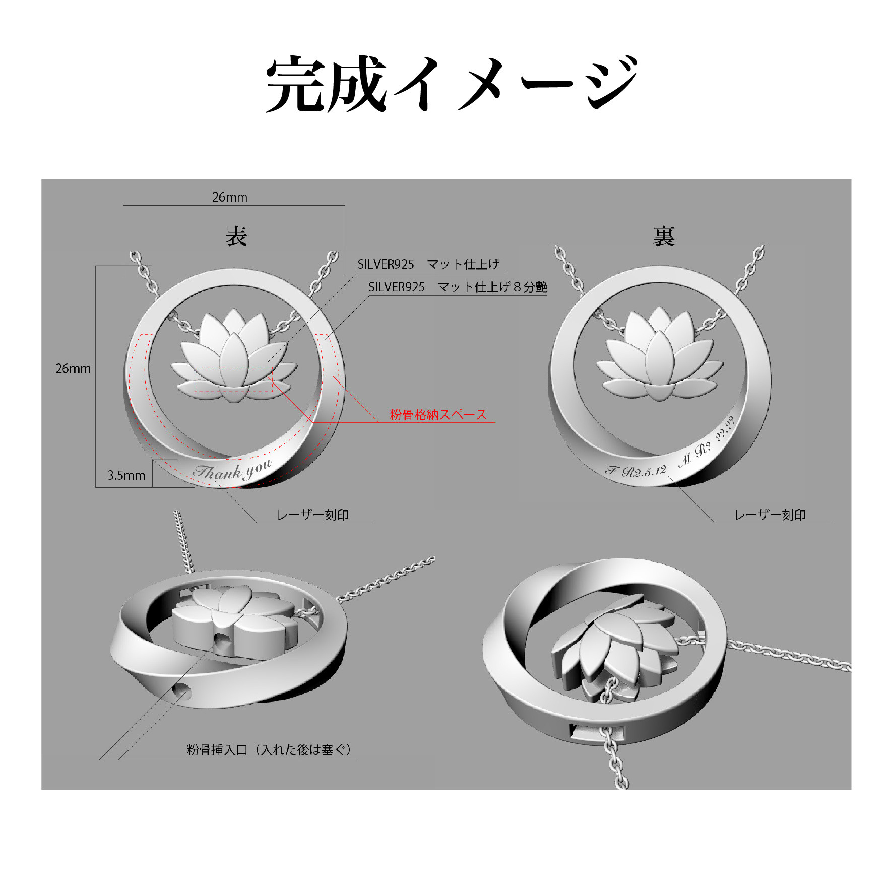 今回の作品はハスの花と捻りリングがモチーフのシルバー製の手元供養ペンダントです。ハスとリングの内部は空洞になっており、両方に粉骨を納める事が可能です。また、2つのパーツは着脱可能なので気分によって違うパーツと組み合わせる事が出来ます。ボリューム感あるペンダントですが、内部が空洞のため見た目以上に軽く長時間付けても肩がこらない様になっており、ペンダントを首に掛ける時にハスとリングが当たって鈴の様な心地よい音が奏でます。