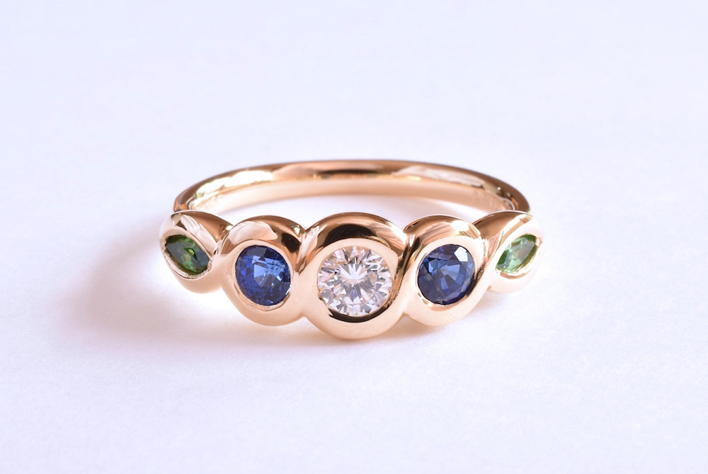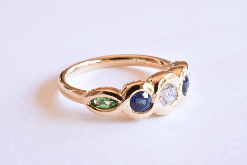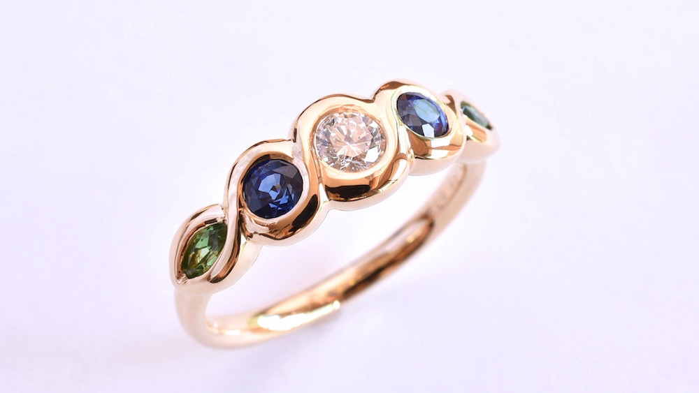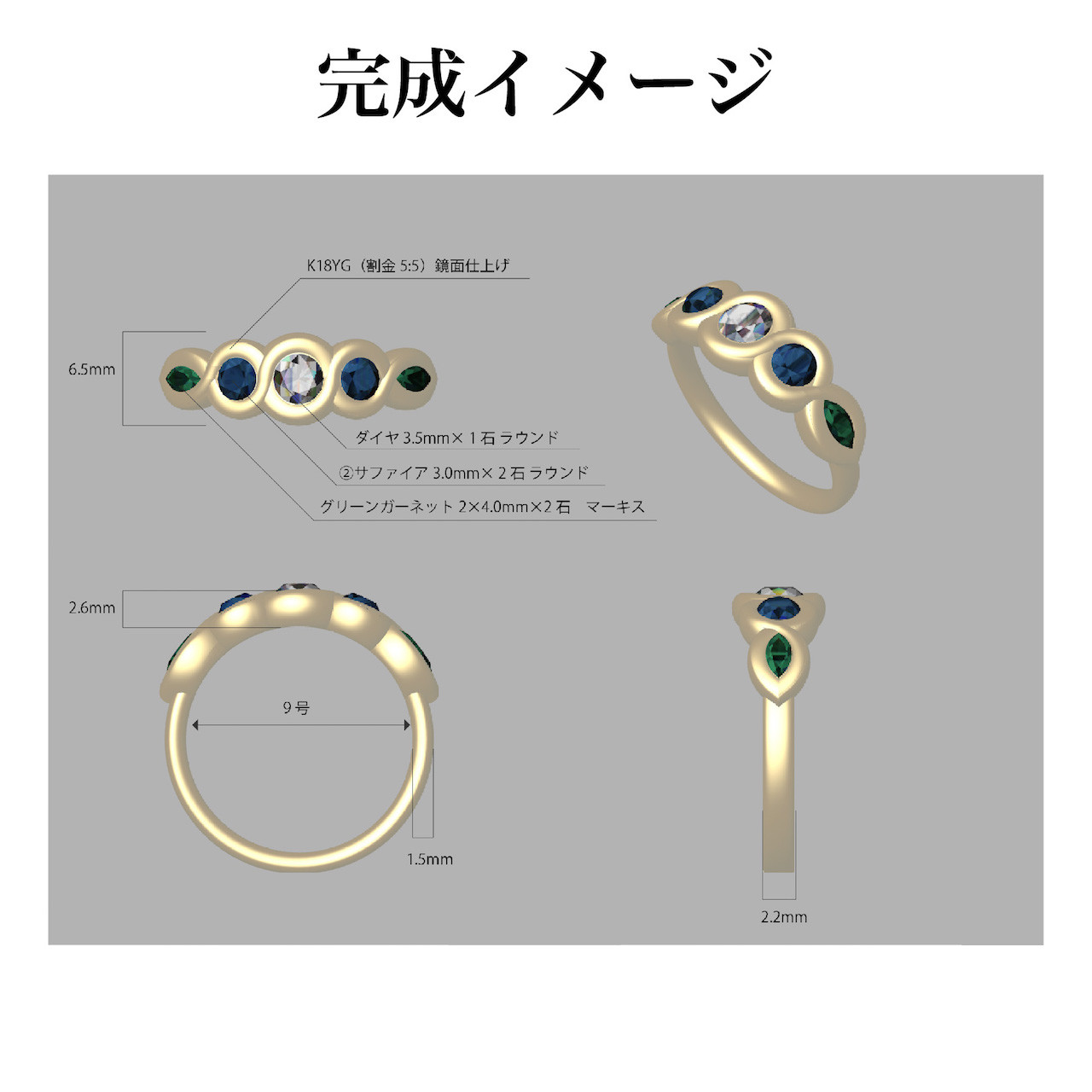 今回の作品は大粒のダイヤモンドに上質なサファイアとグリーンガーネットを添えたハーフエタニティーリングです。頂いたイメージ写真は覆輪が編み込まれた様なデザインが特徴のアンティークリングで、今回はこれにお客様のご希望を盛り込みながら現代風にアレンジして製作させて頂きました。一番端のマーキス型の宝石をグリーンガーネットにする事がお客様こだわりのポイントでしたが、リングのバランス的に、規格サイズより小さなルースを使う必要があった為、グリーンガーネットの最小規格の中で更に小さい個体を選び出して今回のリングを実現する事が出来ました。地金はK18YG 割金(銀/銅5:5)を使用しており、一般的なK18YGよりも赤みを帯びた色合いが特徴です。時間が経てば徐々に味わい深い色に変化していきますので、更にアンティークな雰囲気をお楽しみ頂く事が出来ます。
