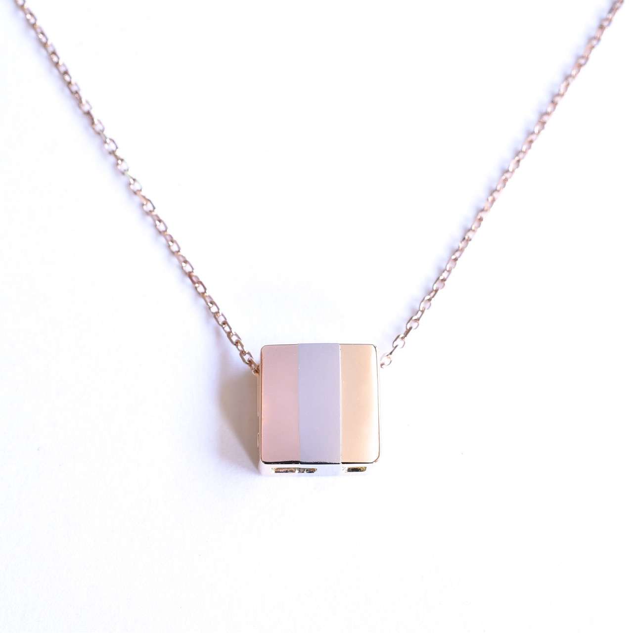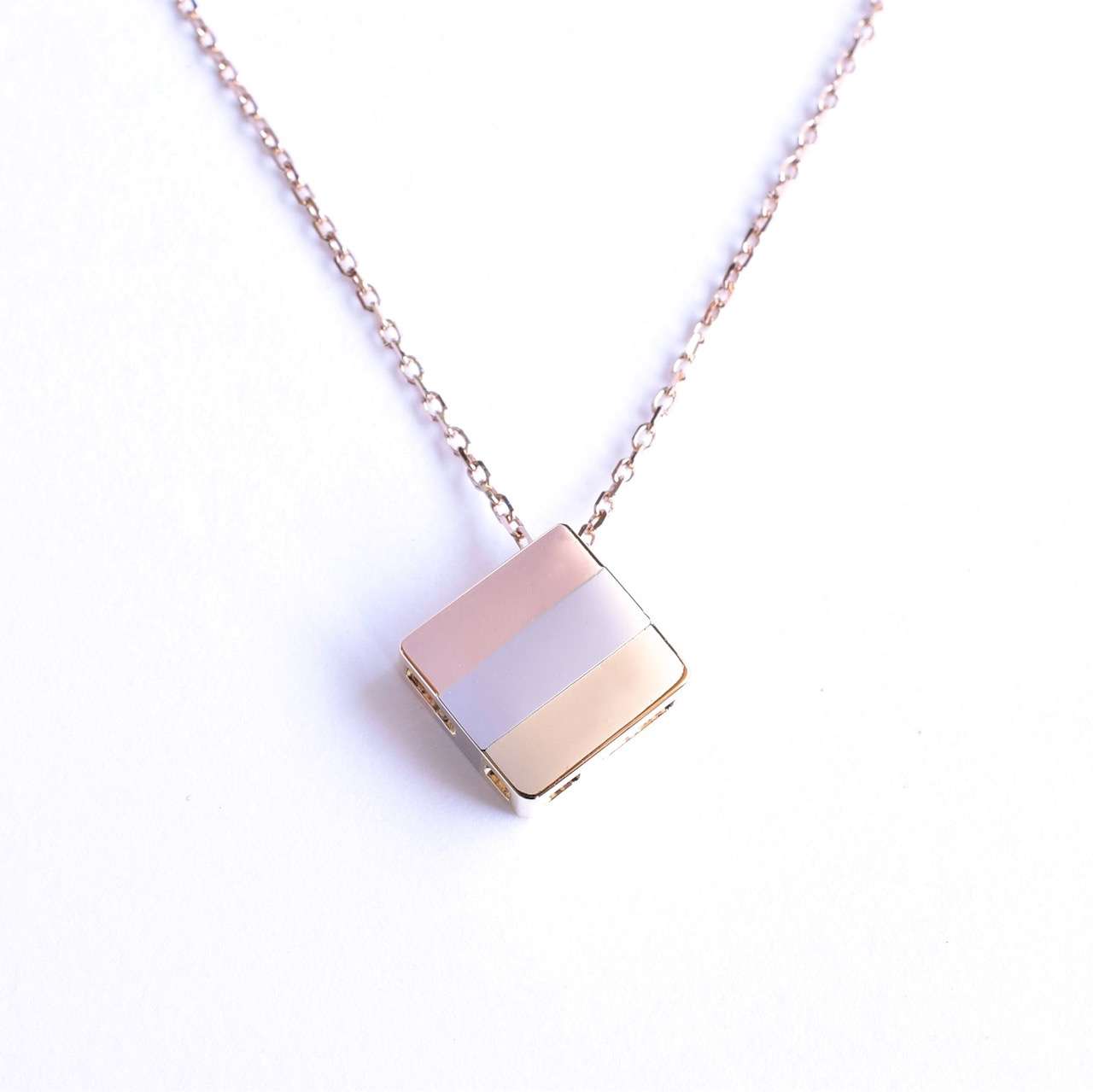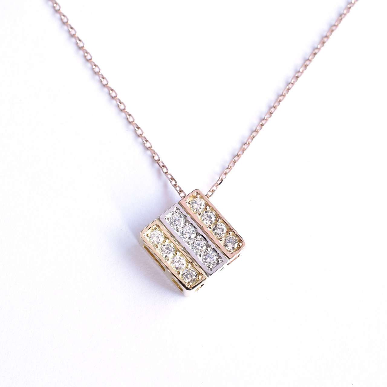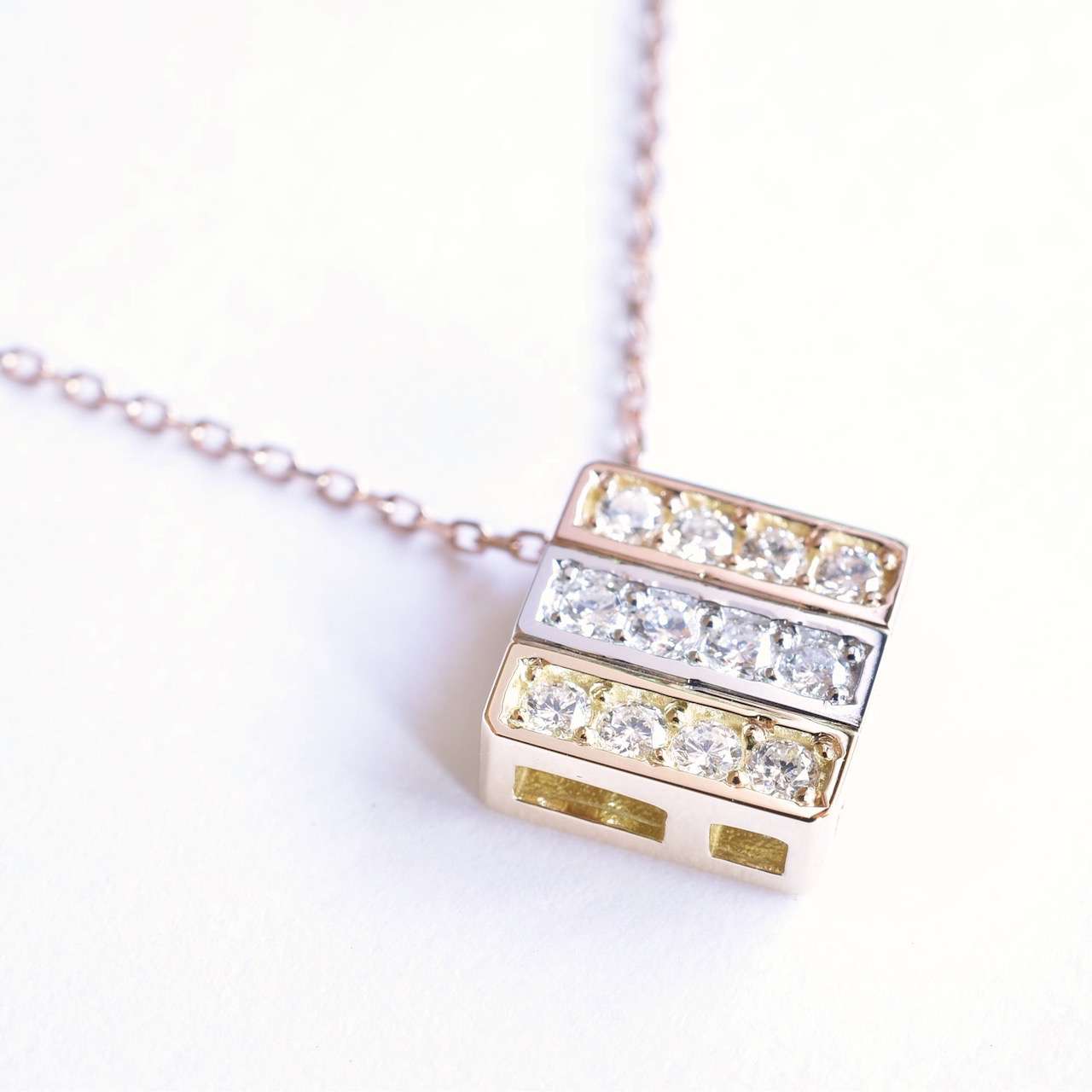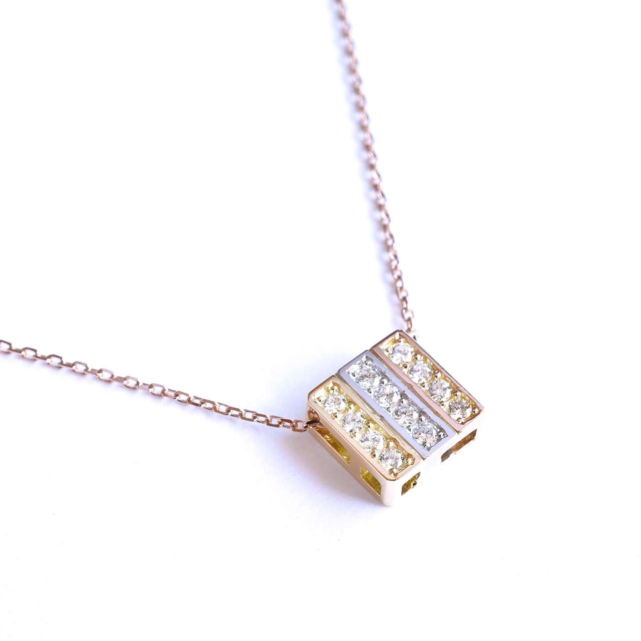 ゴールド、プラチナ、ピンクゴールドをストライプ状にあしらったダイヤモンドペンダントです。チェーンを通す位置を変えれば、縦遣い、斜め使いと向きを変える事ができ、裏面も美しいのでリバーシブルとしてもお使い頂けます。一見シンプルなデザインですがゴールド、プラチナ、ピンクゴールドの3つパーツを鋳造→研磨した後にそれぞれを組み立てて鑞付けしているので、通常のペンダントと比べて3倍以上の手間が掛かっております。