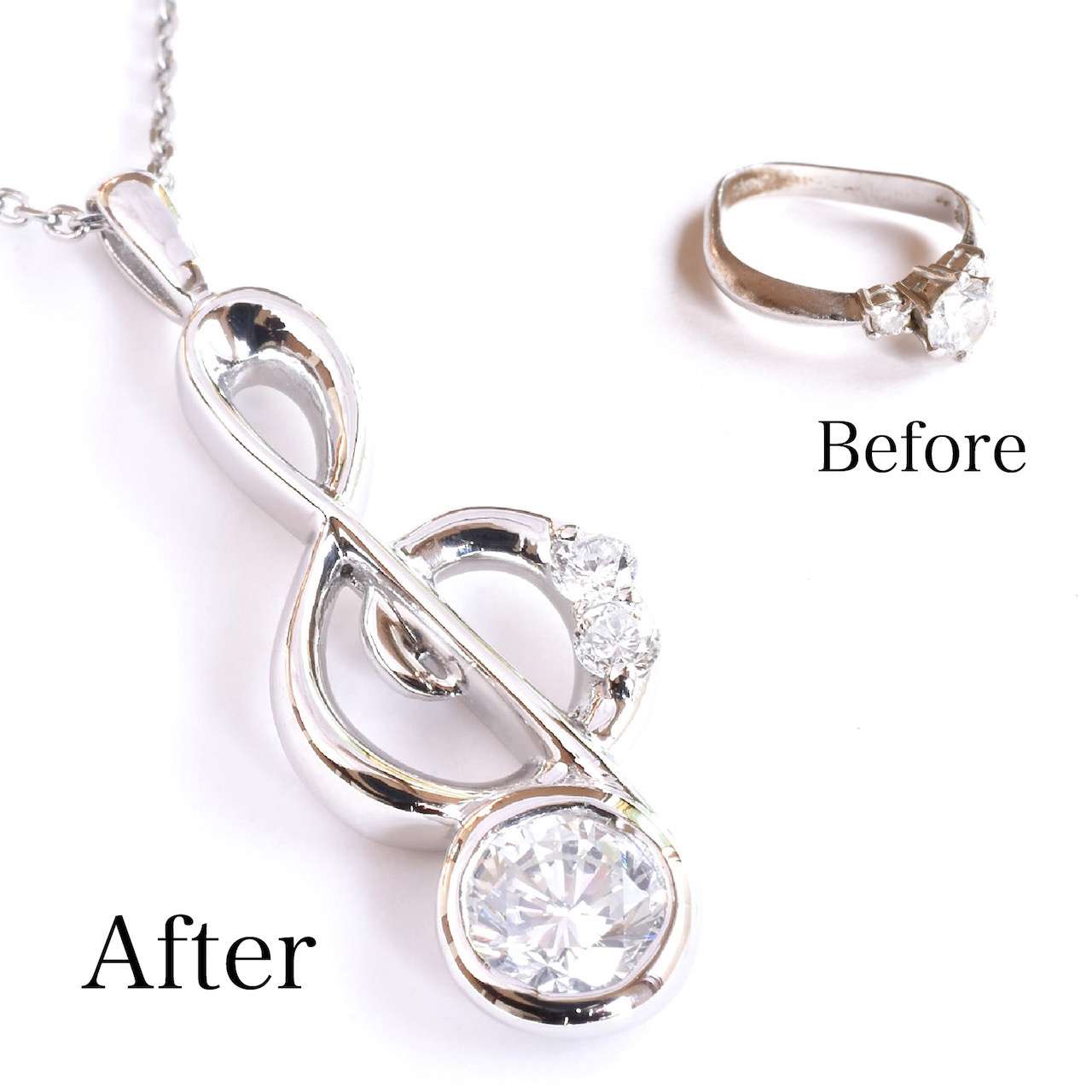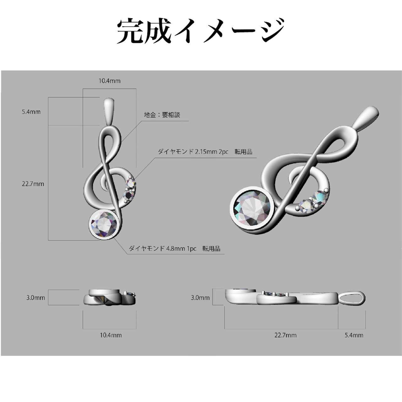 お客様からご支給頂いたプラチナリングのダイヤを全て転用して、音符のペンダントにリメイクさせて頂きました。音符のペンダントは一般的にカジュアルなイメージのものが多いですが、今回の場合、高級素材を多用するので全体的にブライダルリングのような捻りを加えながら曲線を描く事で、可愛さもありながら上品さを感じて頂けるようなデザインしました。