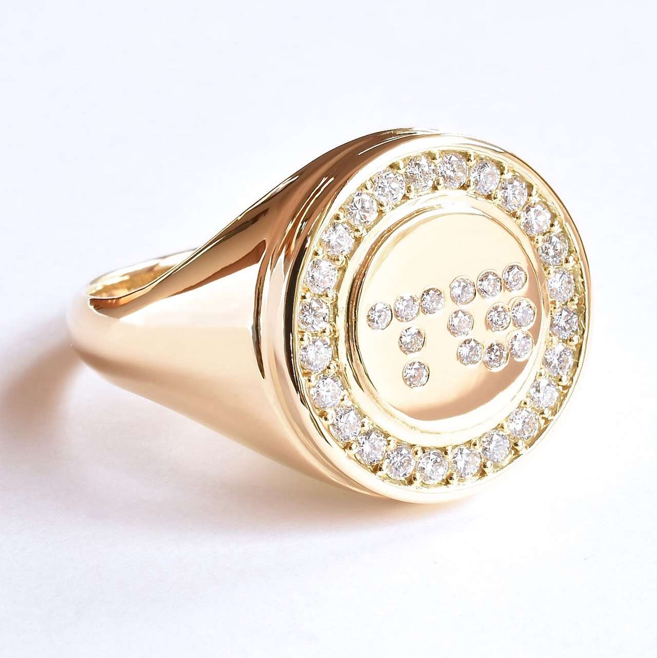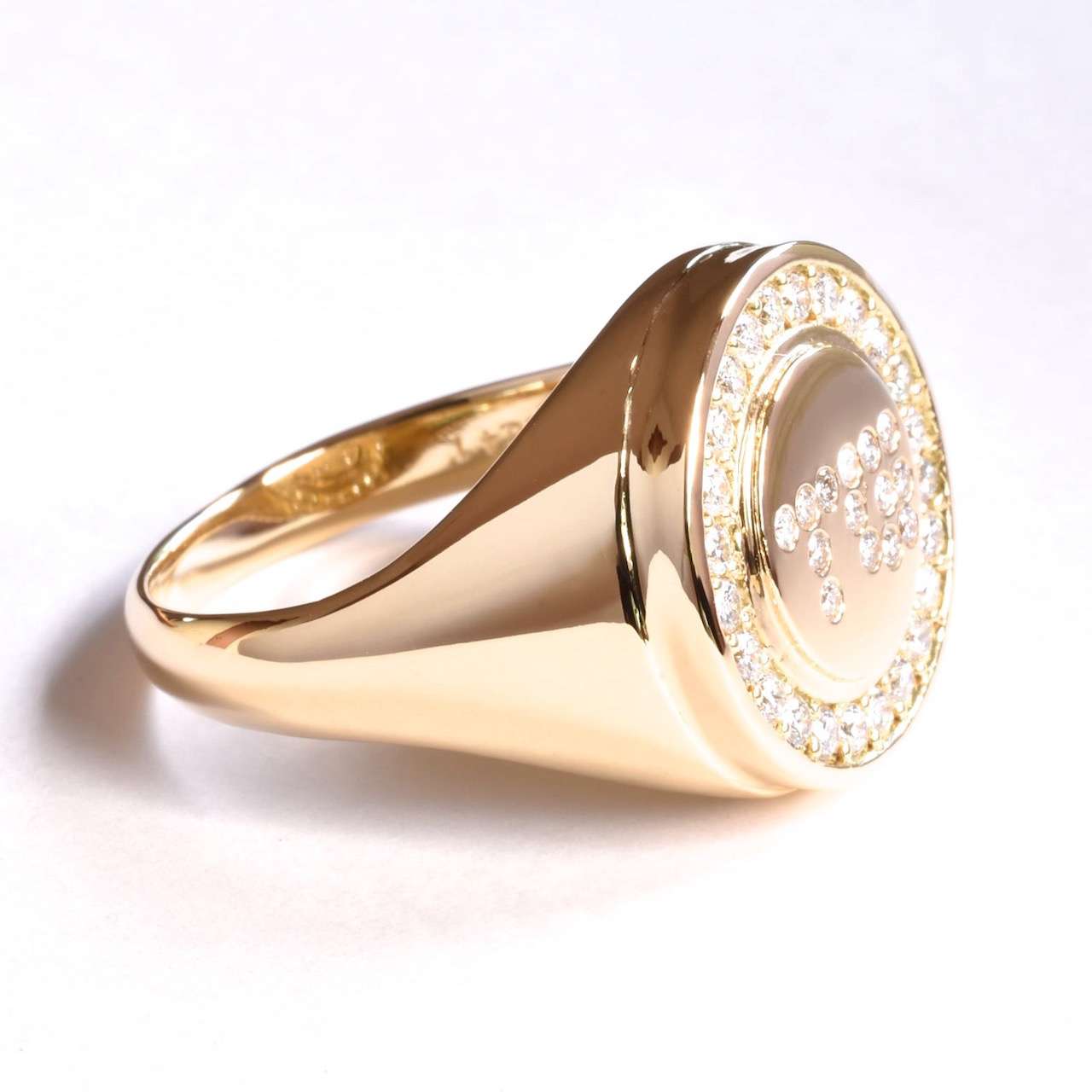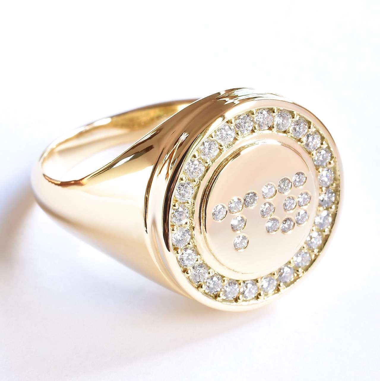 ブライダル ダイヤモンド38石を贅沢にあしらったK18YGのシグネットリングです。センターにはGTのイニシャルが入っております。