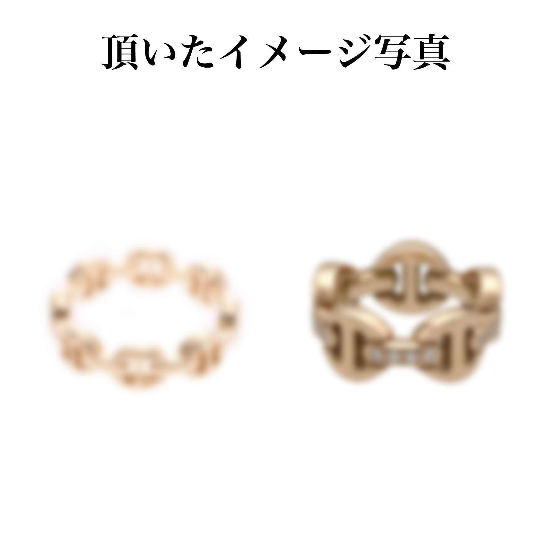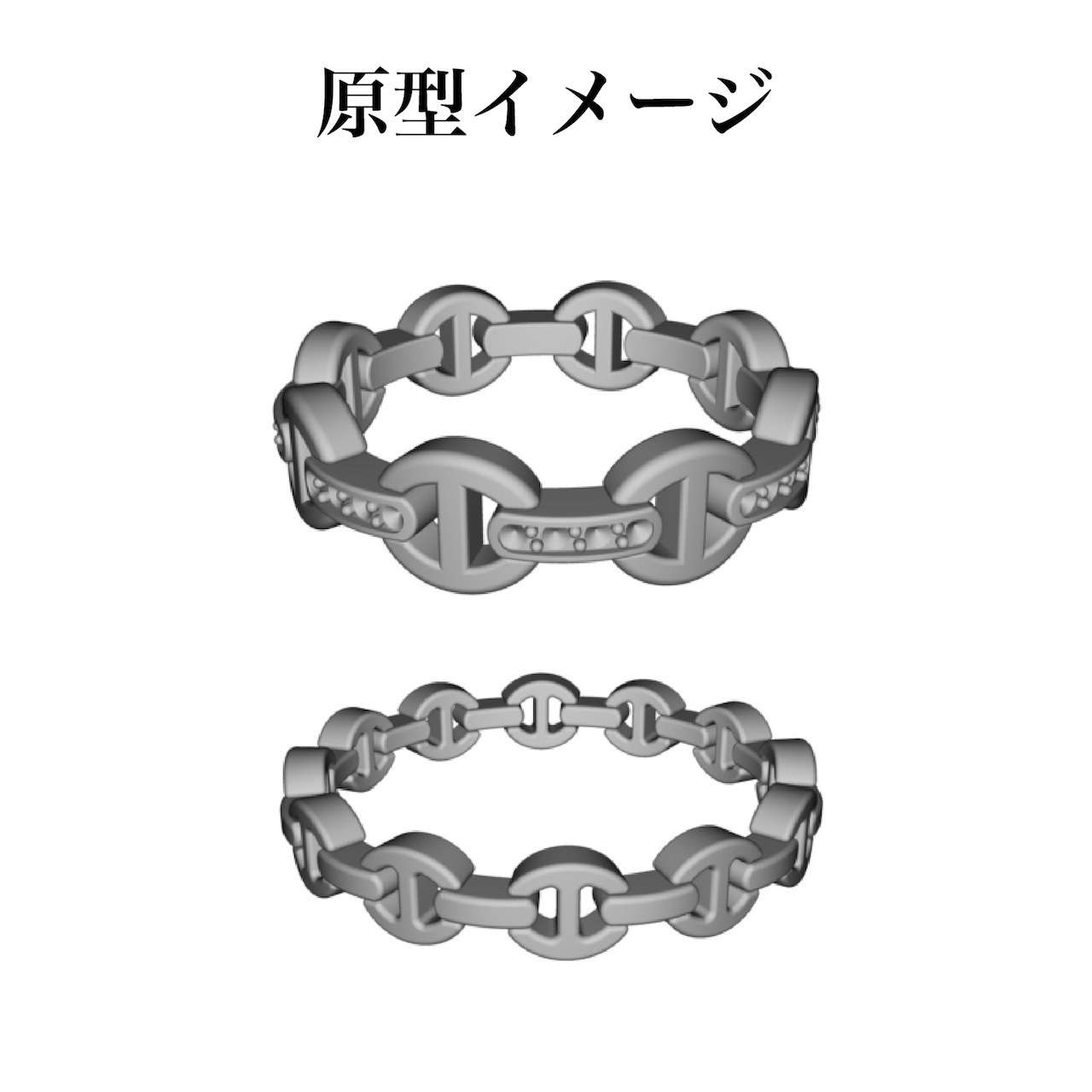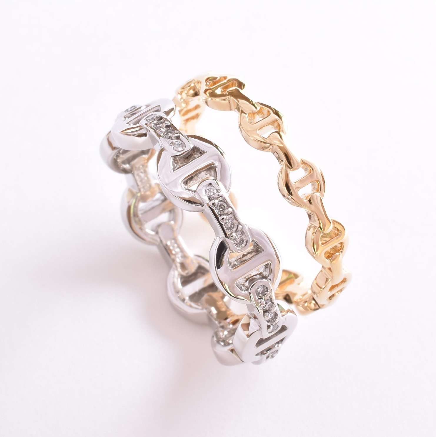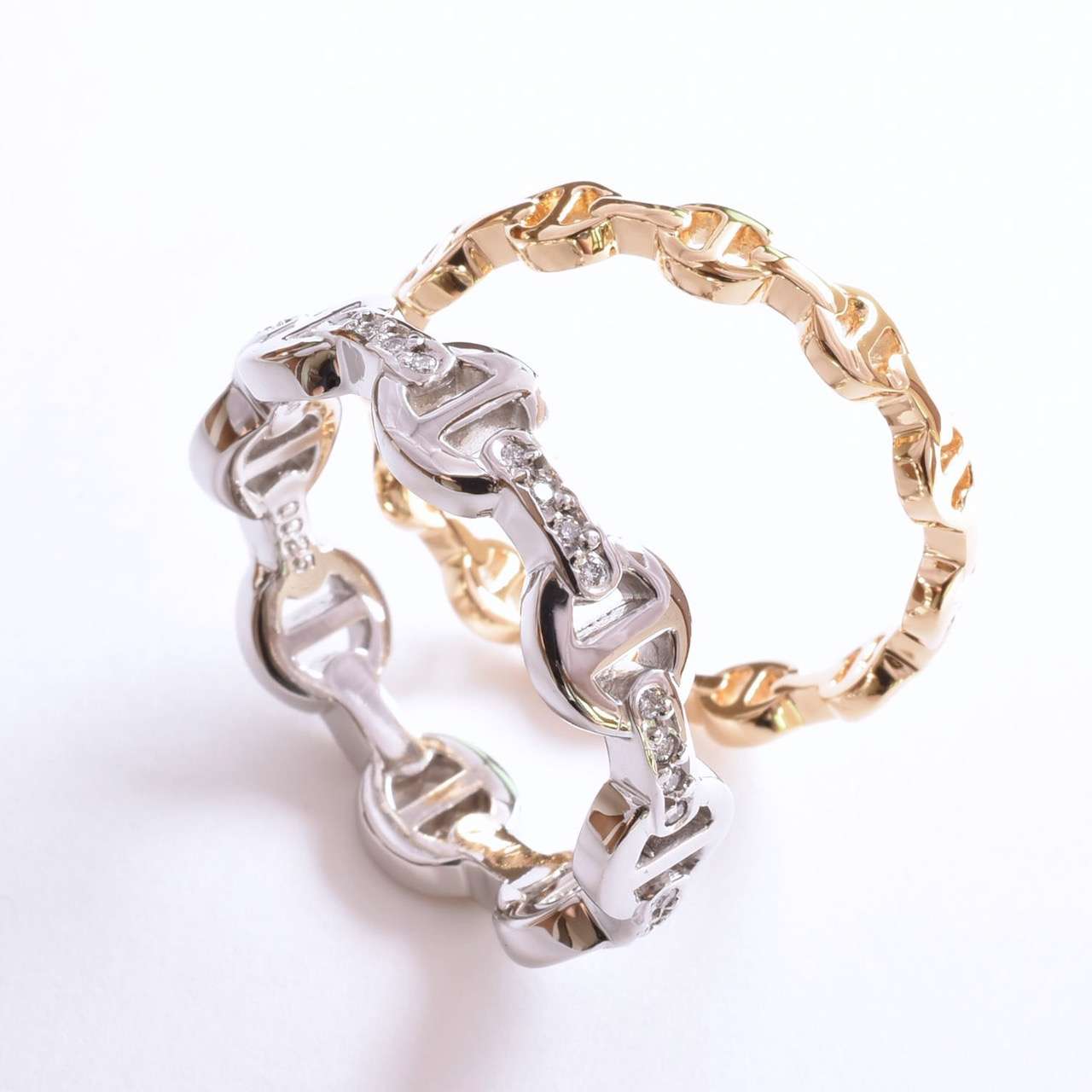 ダイヤモンド32石を贅沢にあしらったPT900製のチェーンリングとK18YG製の細身のチェーンリングです。頂いたイメージ写真を元に製作させて頂きました。チェーンのサイズや間隔で印象が大きく変わるので、お客様の指に合ったオリジナルのサイズ感で設計しました。