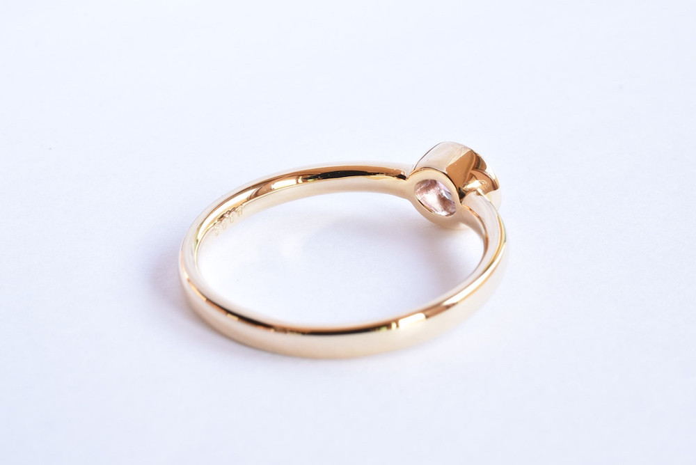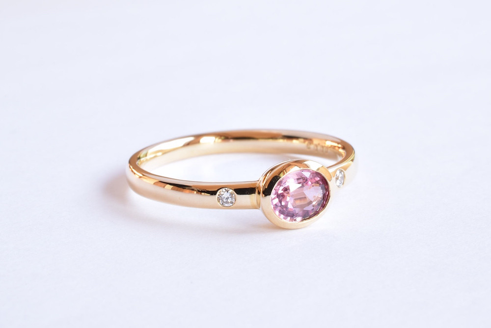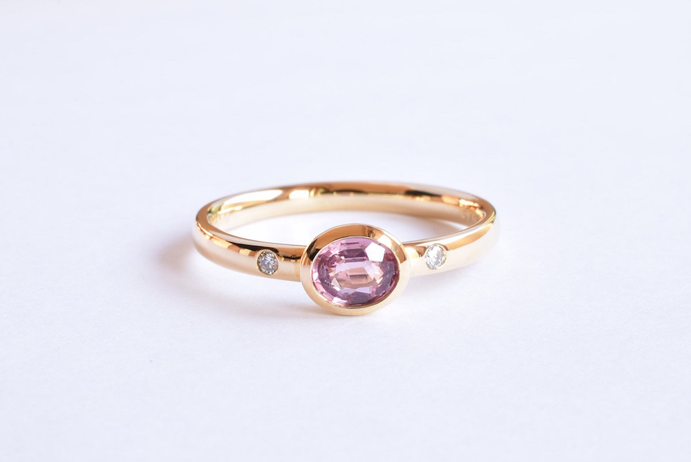 ご支給頂いたパパラチアンサファイアをリングに加工させて頂きました。可愛らしい独特なピンク色を活かす為に、素材はゴールドを選定させて頂き、両サイドにはポイントでダイヤモンドが入っております。覆輪枠は少し内側にテーパードを掛ける事で、スタイリッシュな雰囲気が加わり、カジュアルになり過ぎない様にデザインしました。