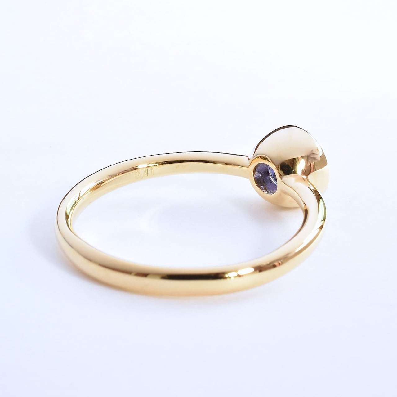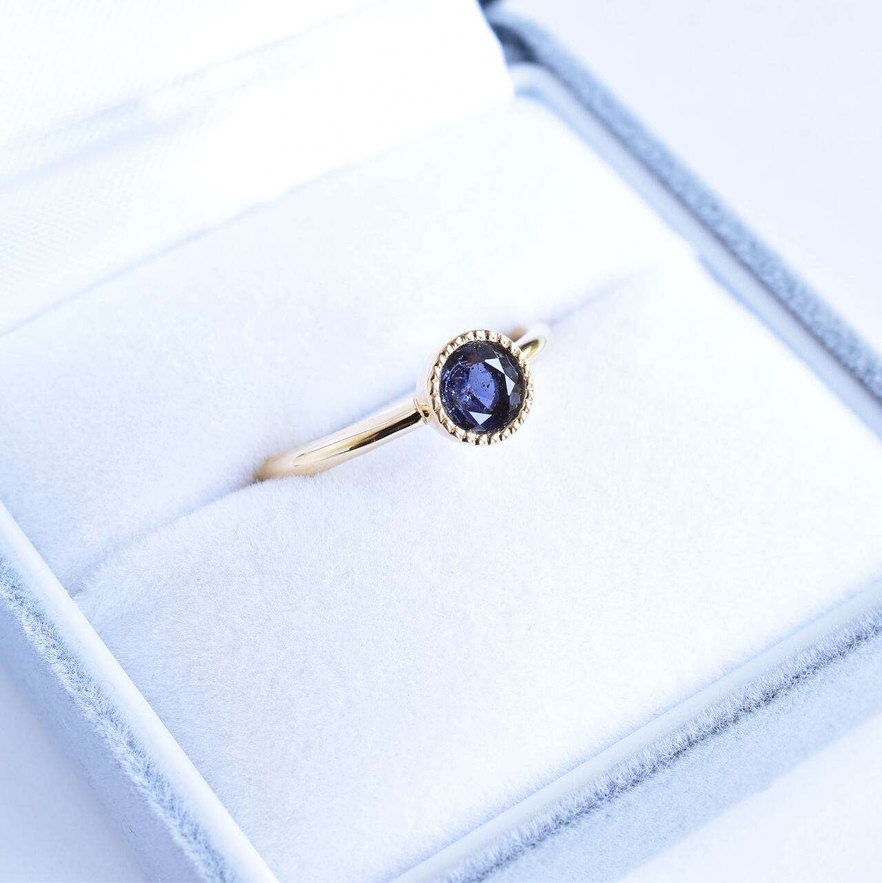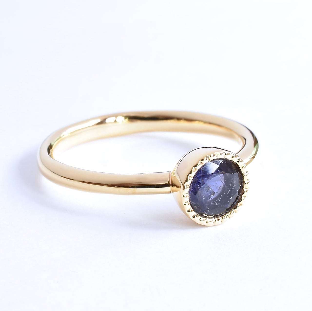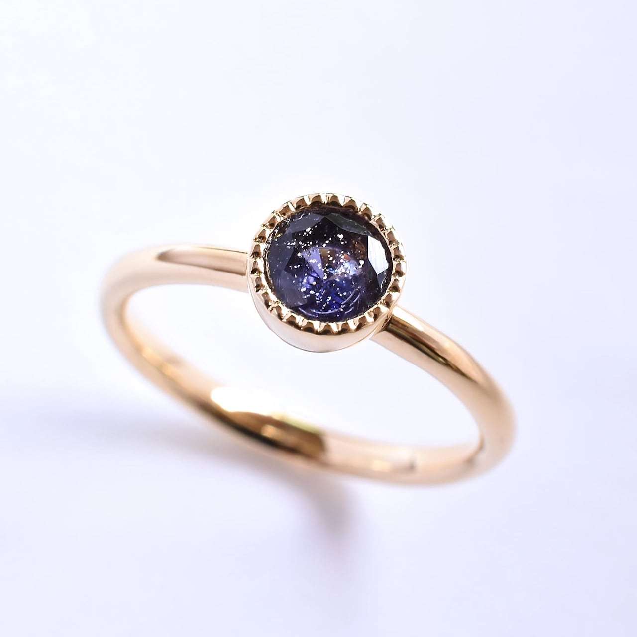 ご支給いただいたアイオライトサンストーンを使ったご依頼です。とてもシンプルなミル打ちリングですが、リングのデザインは"ハメ心地"と"バランス"の両立を目指して徹底的にこだわって設計しました。ぱっと見た感じは分かりづらいですが、リングの厚みは底部が薄く、上部に行くにつれて厚くなっており、幅は底部が広く、上部に行くにつれてテーパードが掛かった形状をしています。