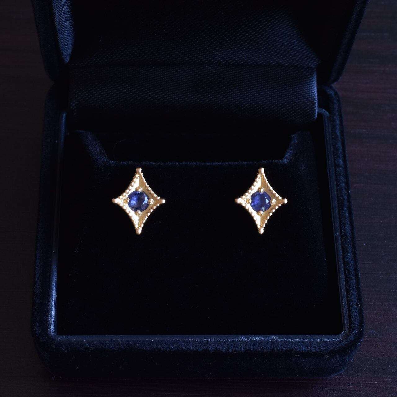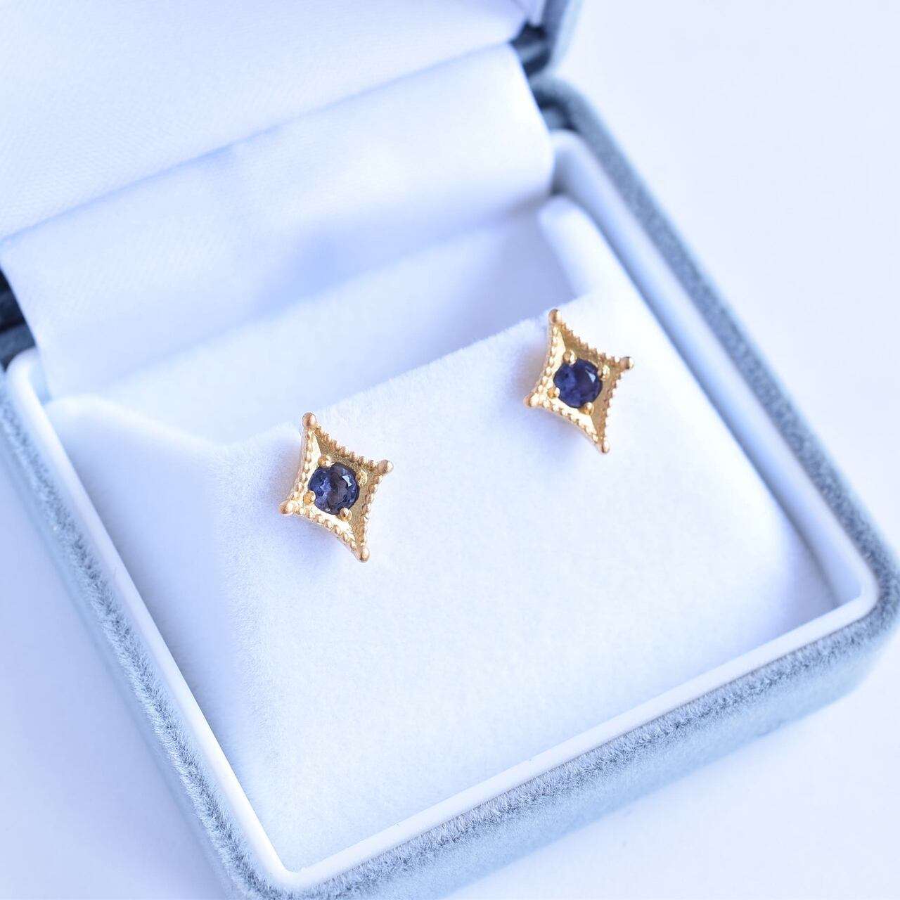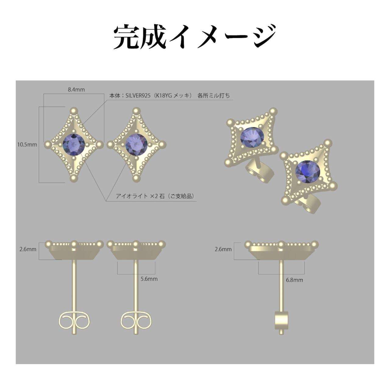 ご支給いただいたアイオライトを使ったオーダーメイドピアスの事例です。参考写真を元に、お客様のご要望を盛り込みながらデザインを決めていきました。周囲のミルと、テーパード状に窪ませたマス留めが今回のポイントでございます。レトロな雰囲気がありつつ、すっきりとしたデザインに仕上げる事が出来ました。