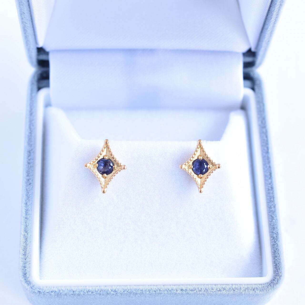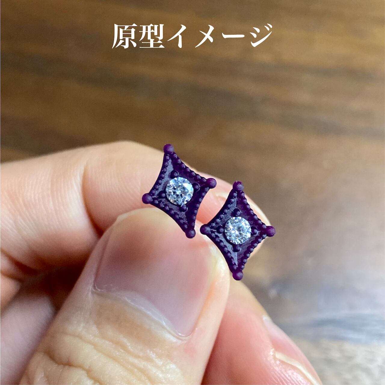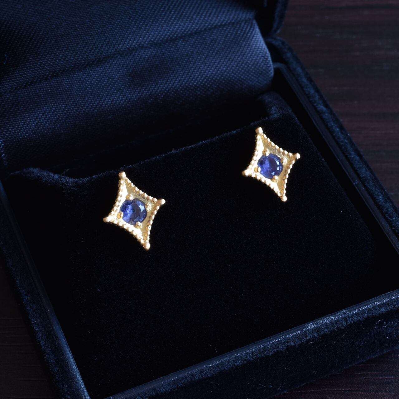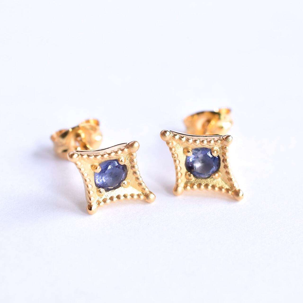 ご支給いただいたアイオライトを使ったオーダーメイドピアスの事例です。参考写真を元に、お客様のご要望を盛り込みながらデザインを決めていきました。周囲のミルと、テーパード状に窪ませたマス留めが今回のポイントでございます。レトロな雰囲気がありつつ、すっきりとしたデザインに仕上げる事が出来ました。