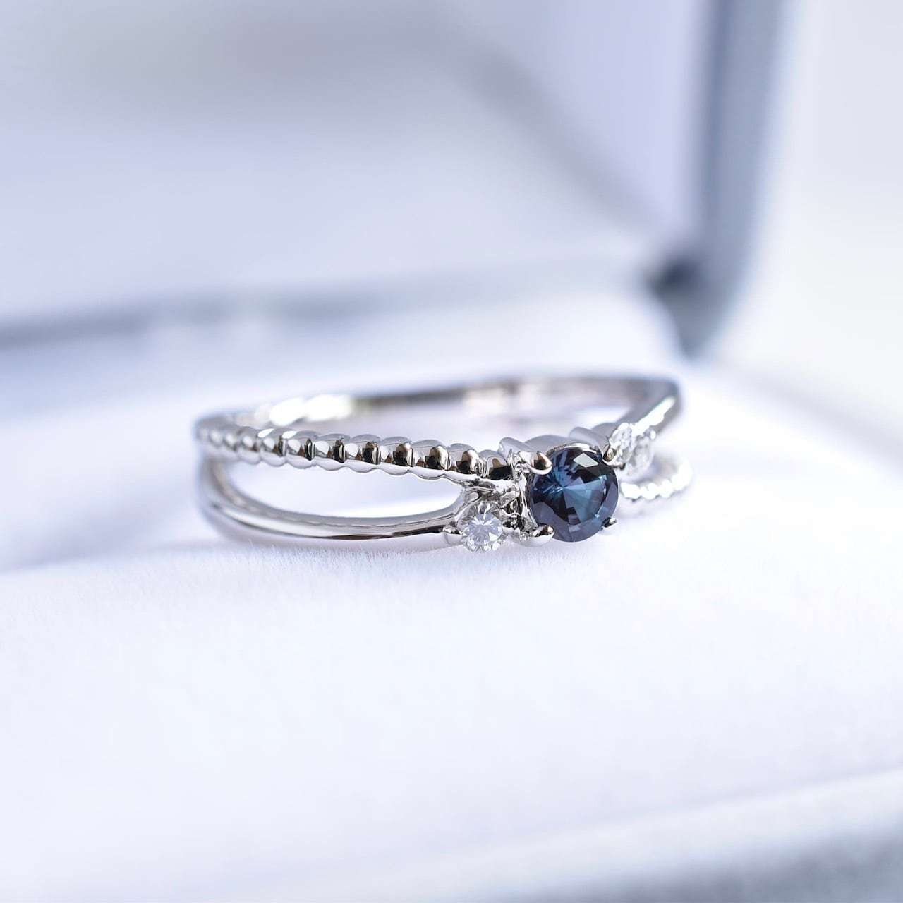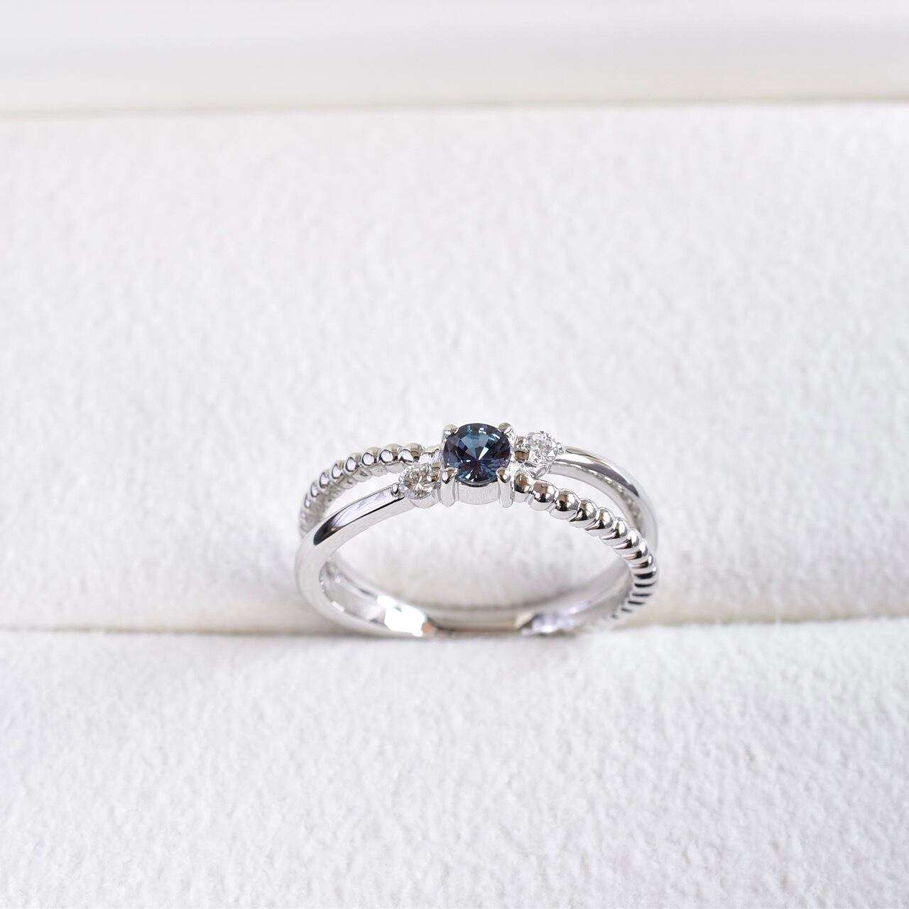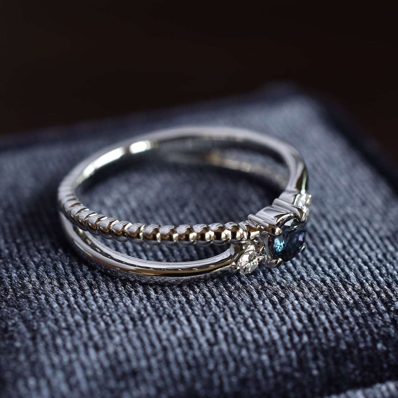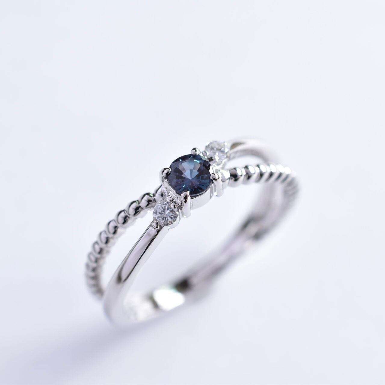 ご支給いただいたアレキサンドライトを使用したオーダーメイドのプラチナリングです。デザインは弊社の過去実績を参考にご依頼いただきました。濃紺で変色具合もはっきりしている希少なアレキサンドライトでしたので、大変美しいリングに仕上がりました。