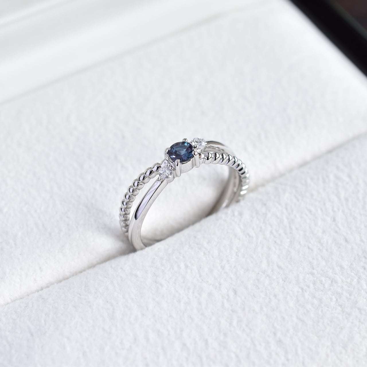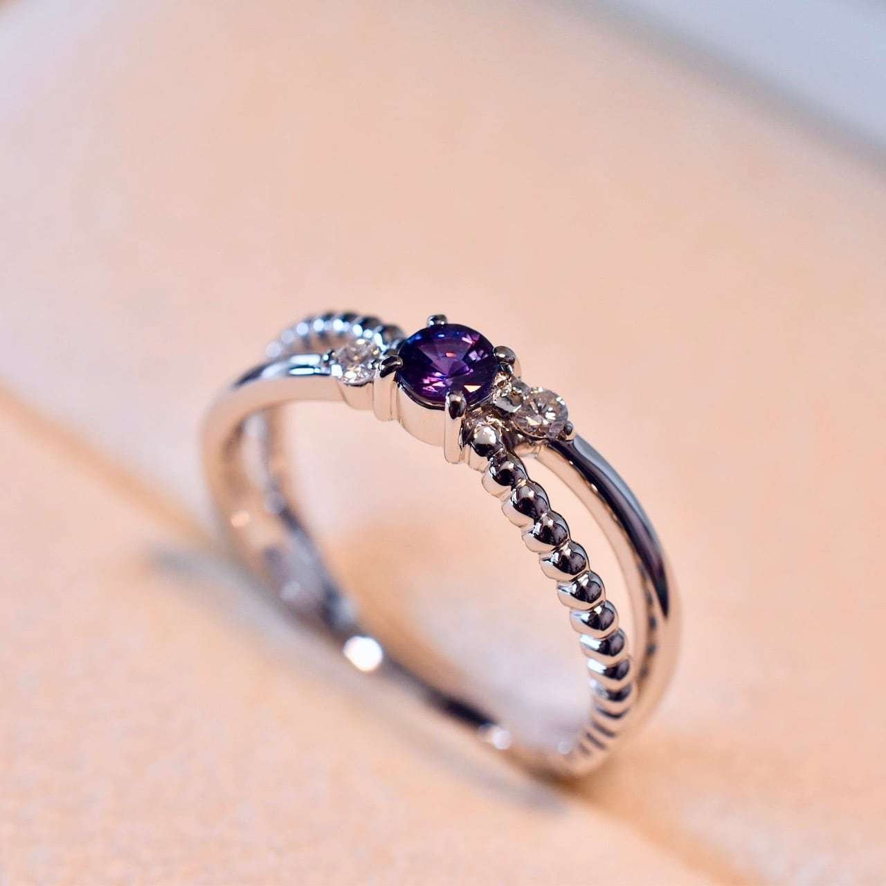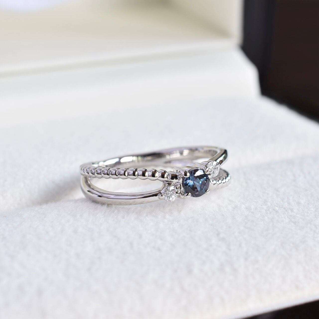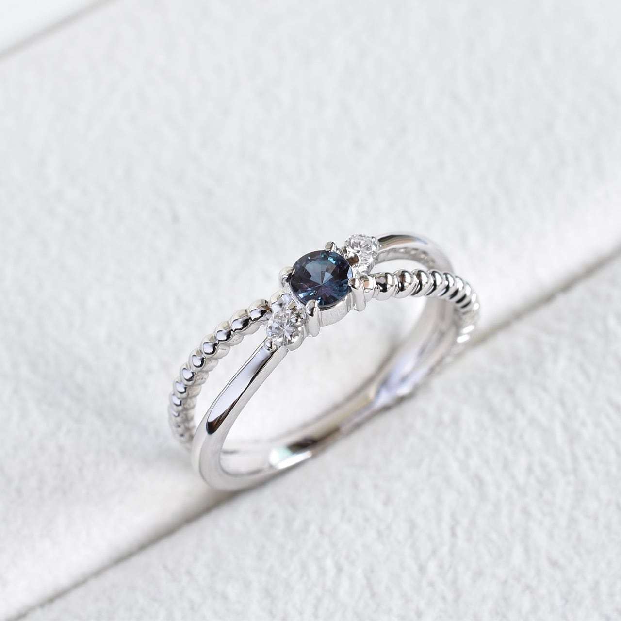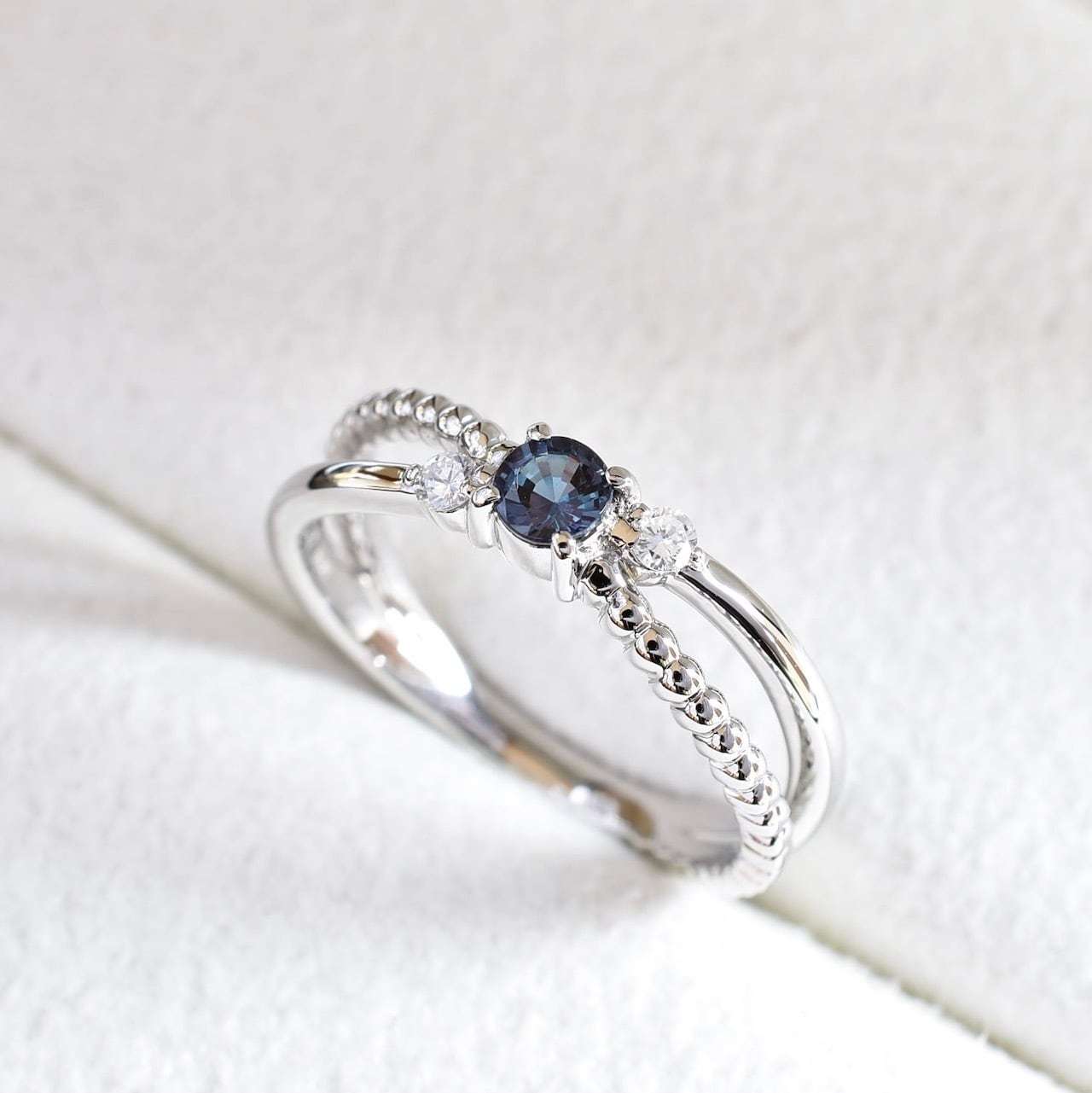 ご支給いただいたアレキサンドライトを使用したオーダーメイドのプラチナリングです。デザインは弊社の過去実績を参考にご依頼いただきました。濃紺で変色具合もはっきりしている希少なアレキサンドライトでしたので、大変美しいリングに仕上がりました。