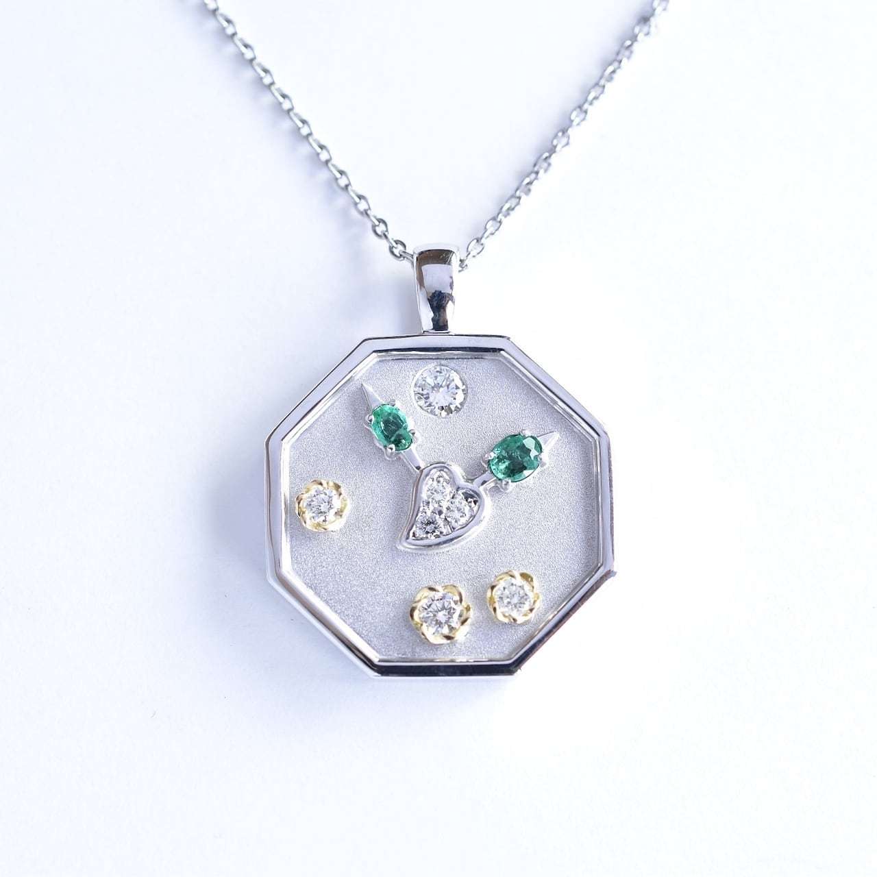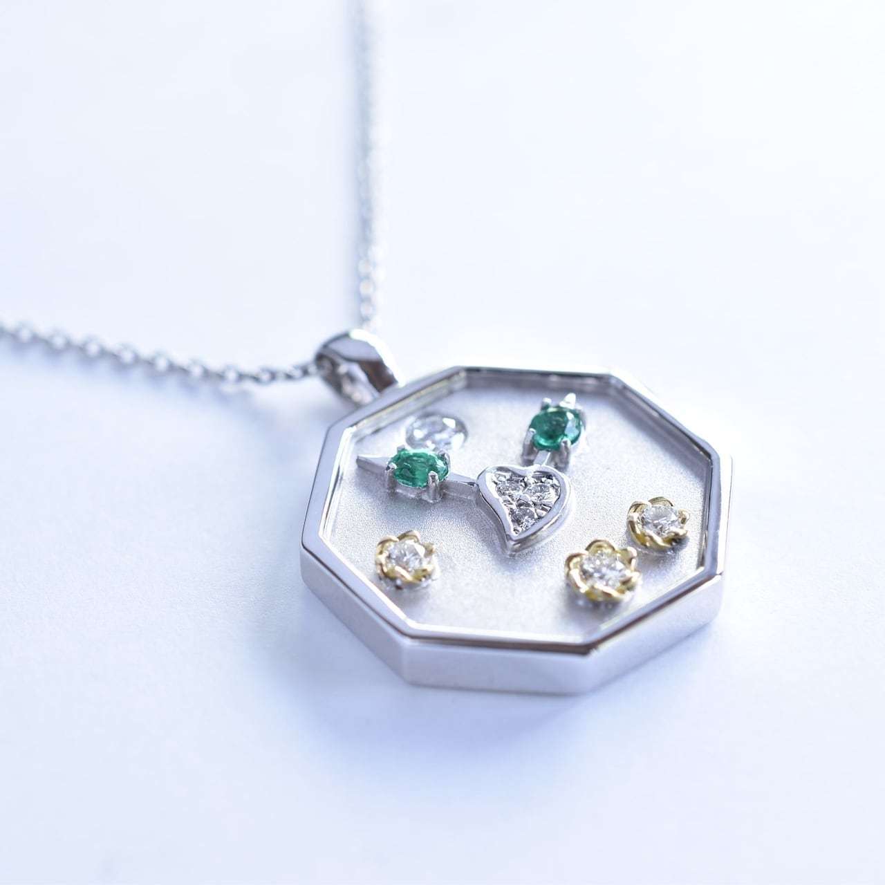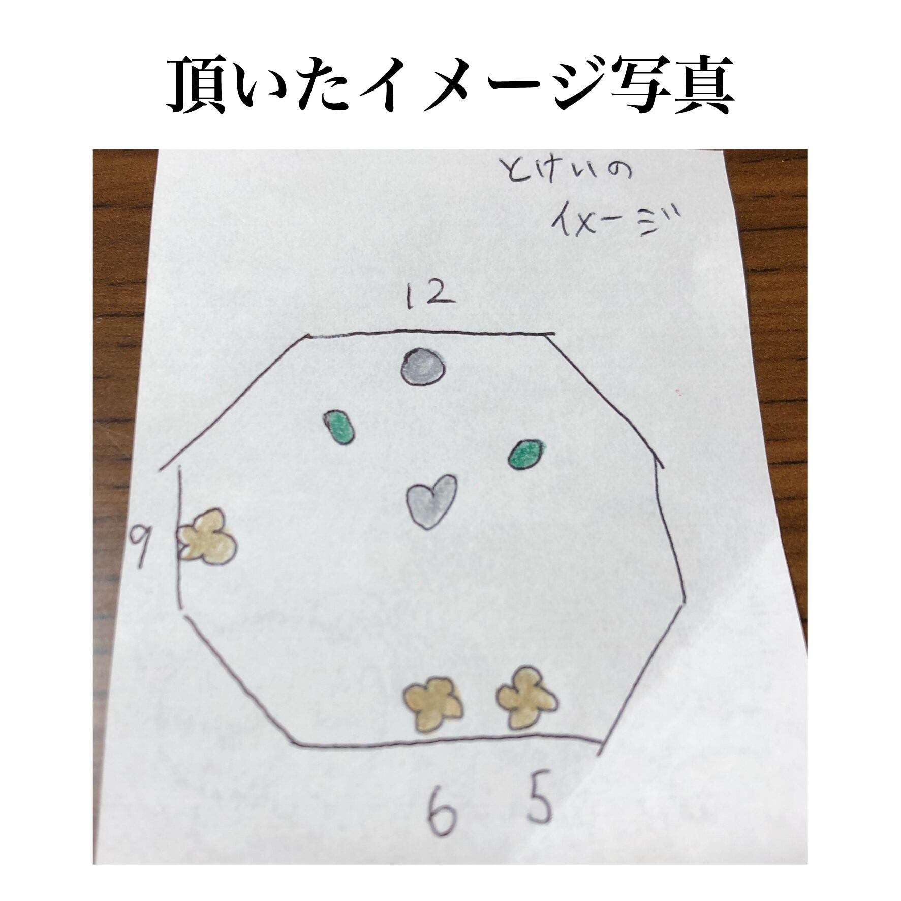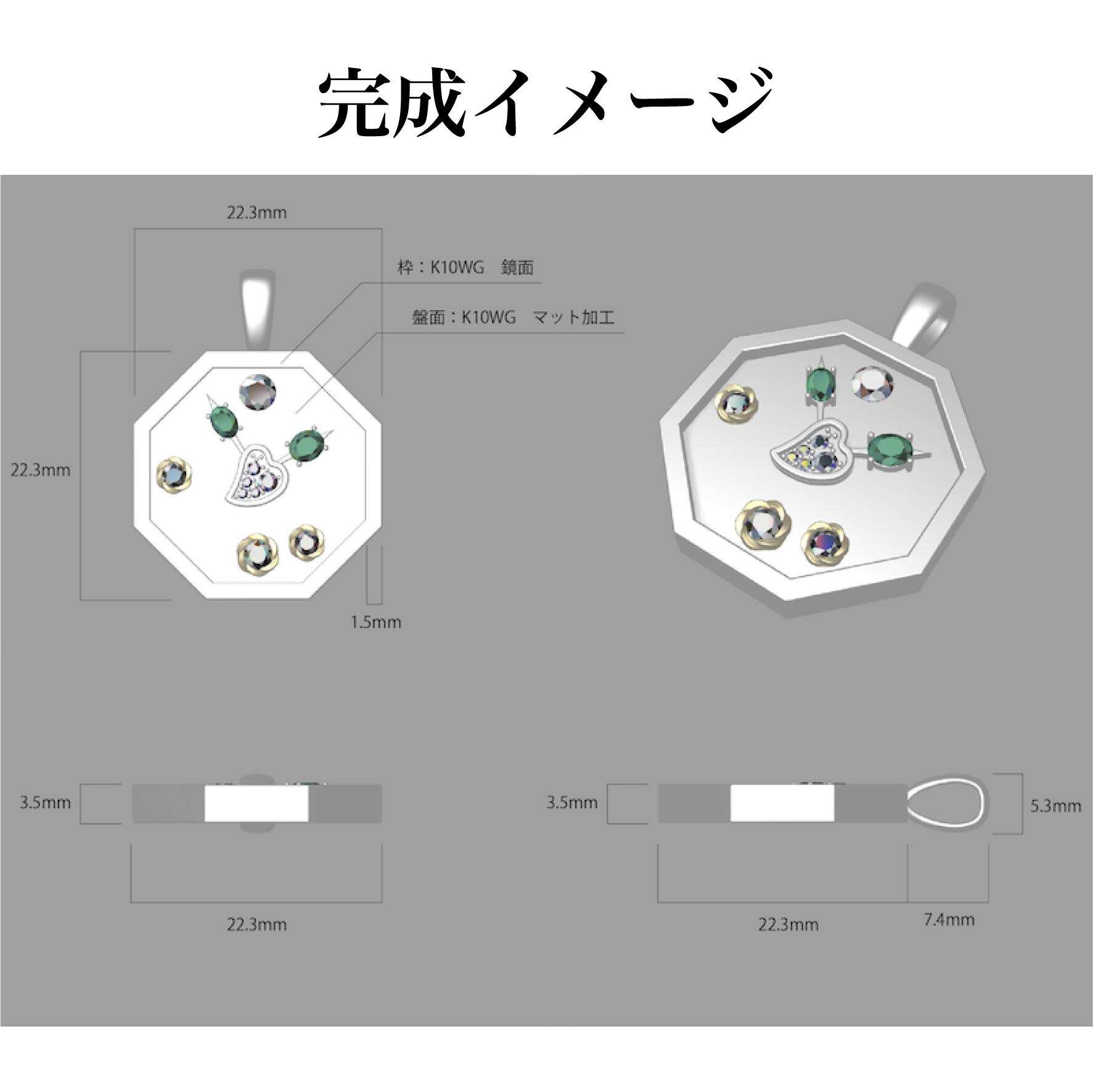 使わなくなったピアスとリングのパーツを転用し、お客様のルースを新たに加えて製作した時計モチーフのペンダントトップです。デザインは頂いたスケッチが元となっており、宝石が指す時刻はお客様にとって大切な想いが込められております。今回のモチーフは加工が難しい仕様の為、時計パーツは3つに分け、そこに転用パーツ4つが加わり、合計7パーツの鑞付けで構成されています。転用するお花とハートのパーツは、時計の盤面に埋め込むようにロウ付けする事で、全体の高さを抑え、より時計らしさを感じる美しい見栄えになるよう製作しました。