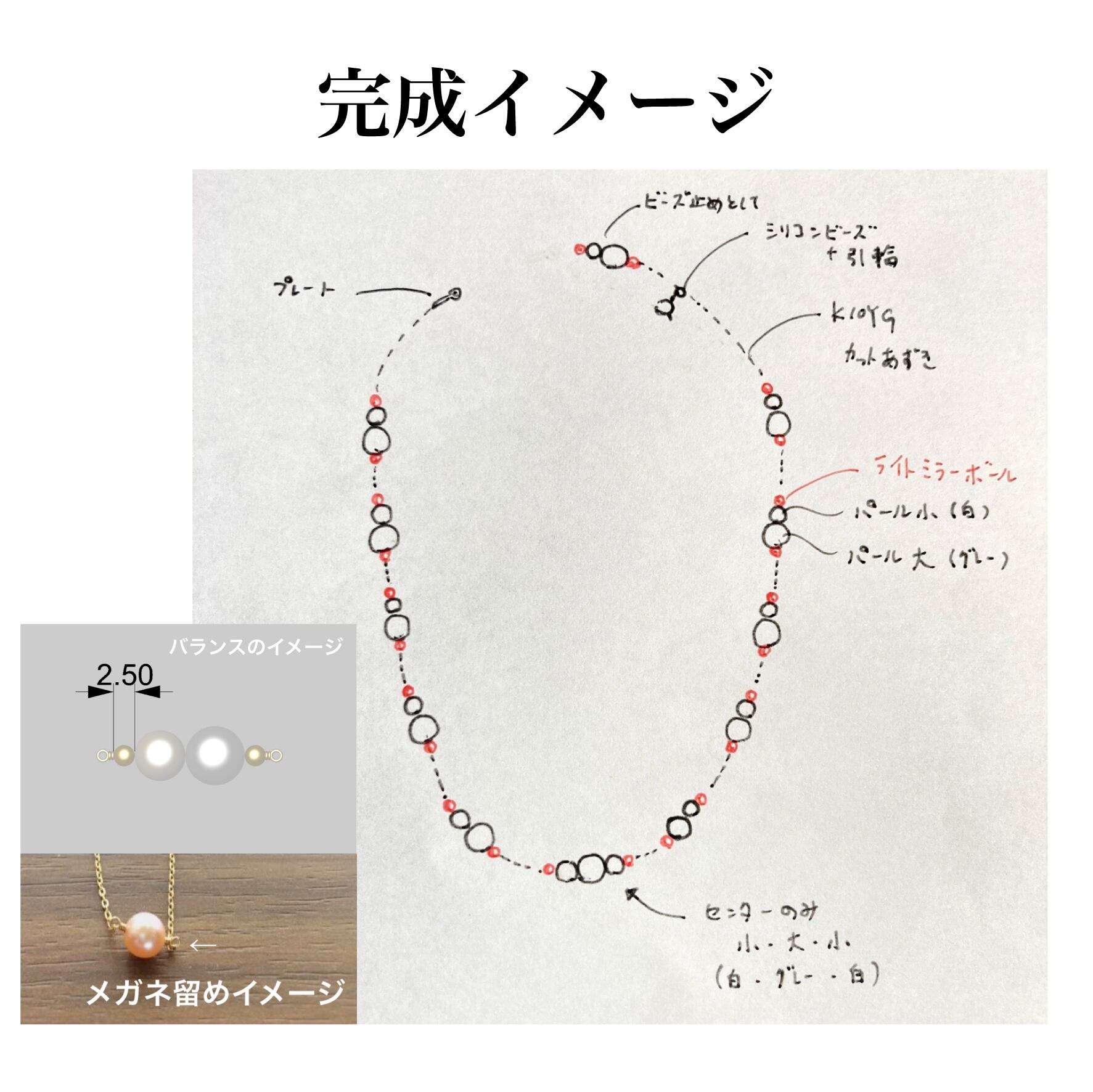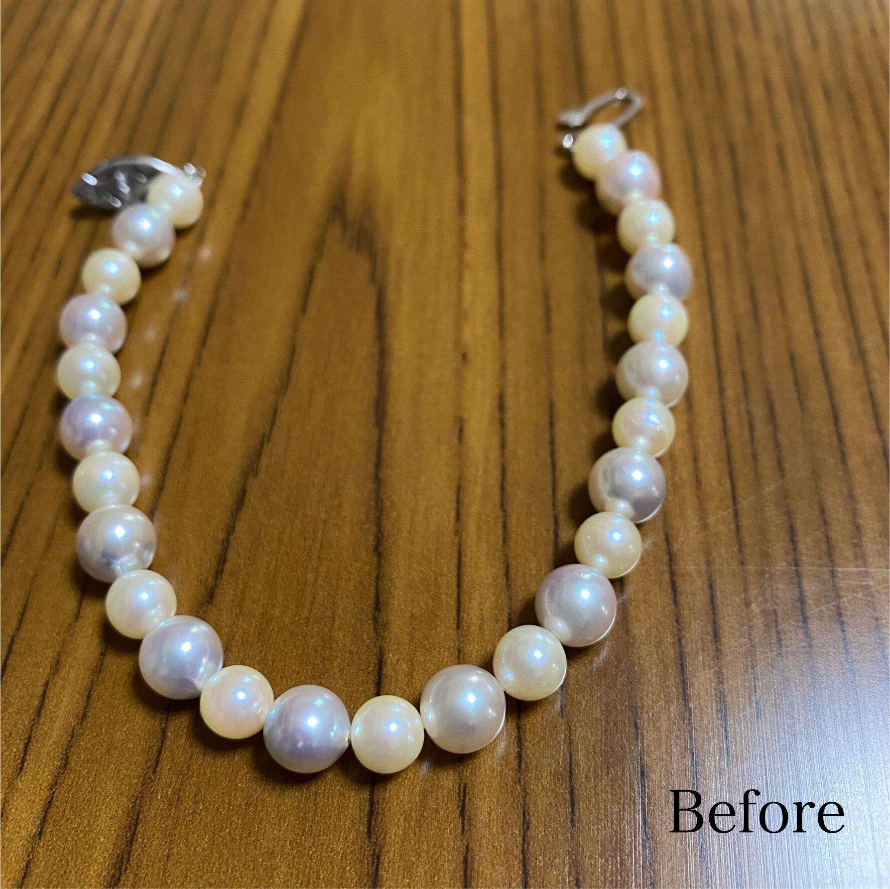 使わなくなった真珠のブレスレットを解体して、新たにK10YGのステーションネックレスに加工させていただきました。白とグレーの真珠とミラーボールがセットになったデザインで、全てメガネ留めで繋げて製作しております。シンプルで使いやすく、旧ジュエリーの個性も活かせた素晴らしいリメイク事例となりました。