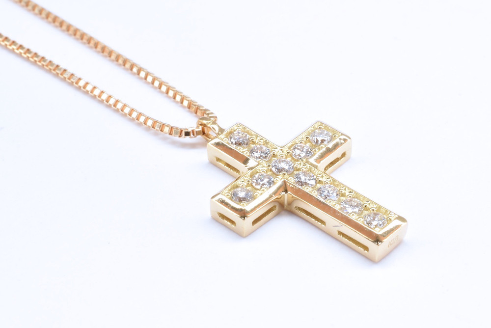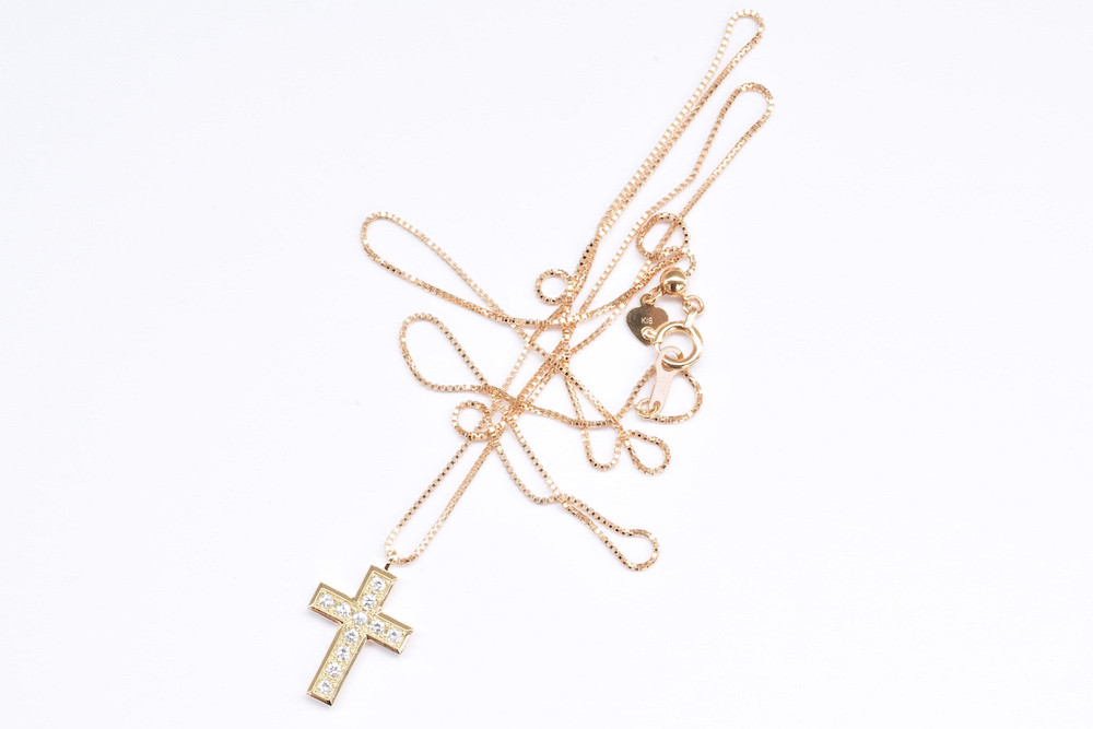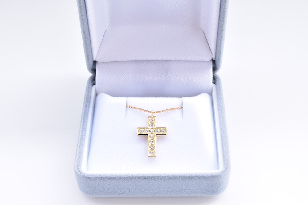有名ブランドの写真を元に、ご予算以内で製作させて頂いたK18YG製のクロスペンダントです。本家はプリンセスカットのダイヤが使用されていますが、今回はご予算以内に収めるためにラウンドカットのダイヤで代用しました。ダイヤのグレードはハイブランドで使用されるようなVSクラス以上のもので製作しておりますので、本家に負けない輝きを放ちながらも本家の半額程度の金額で実現出来ました。