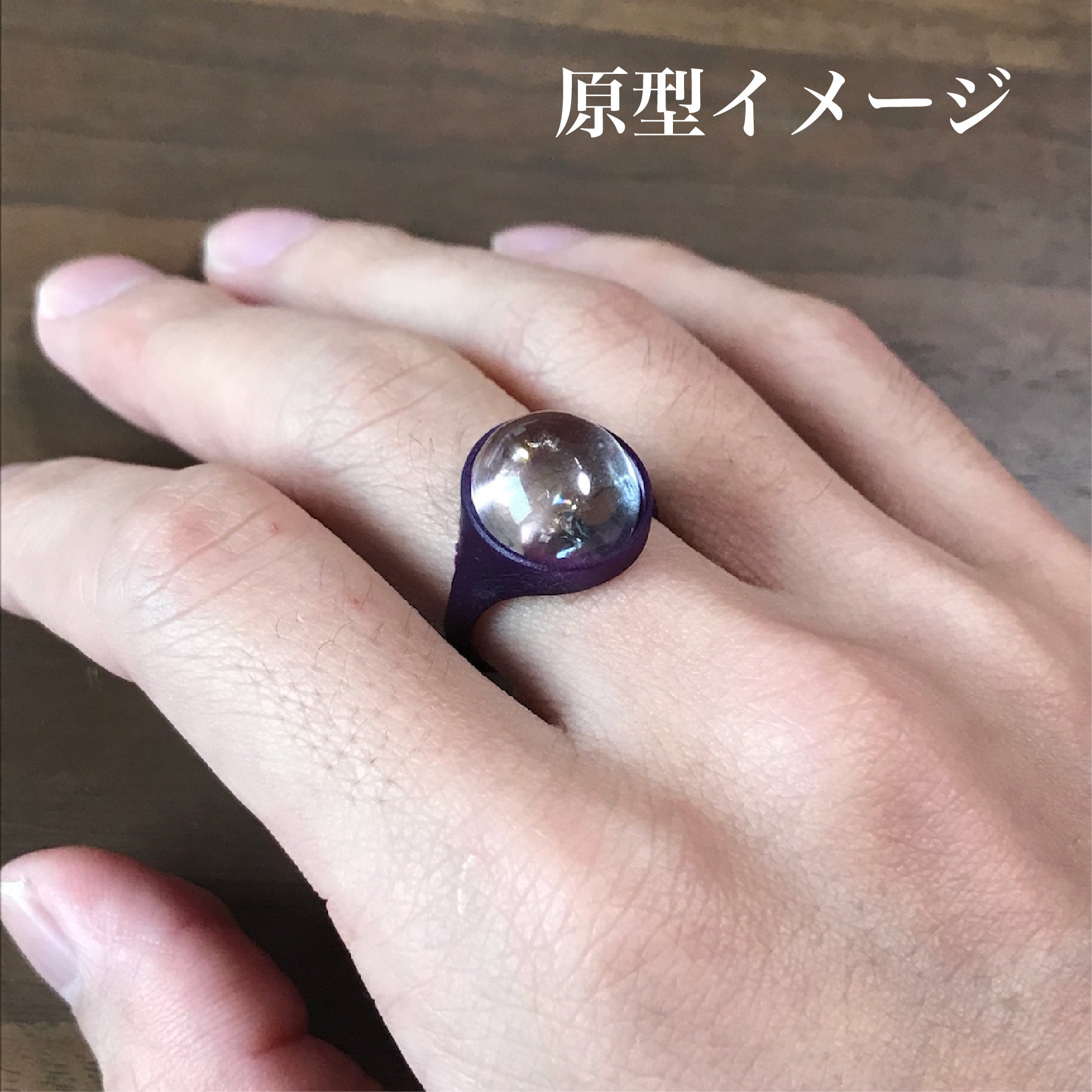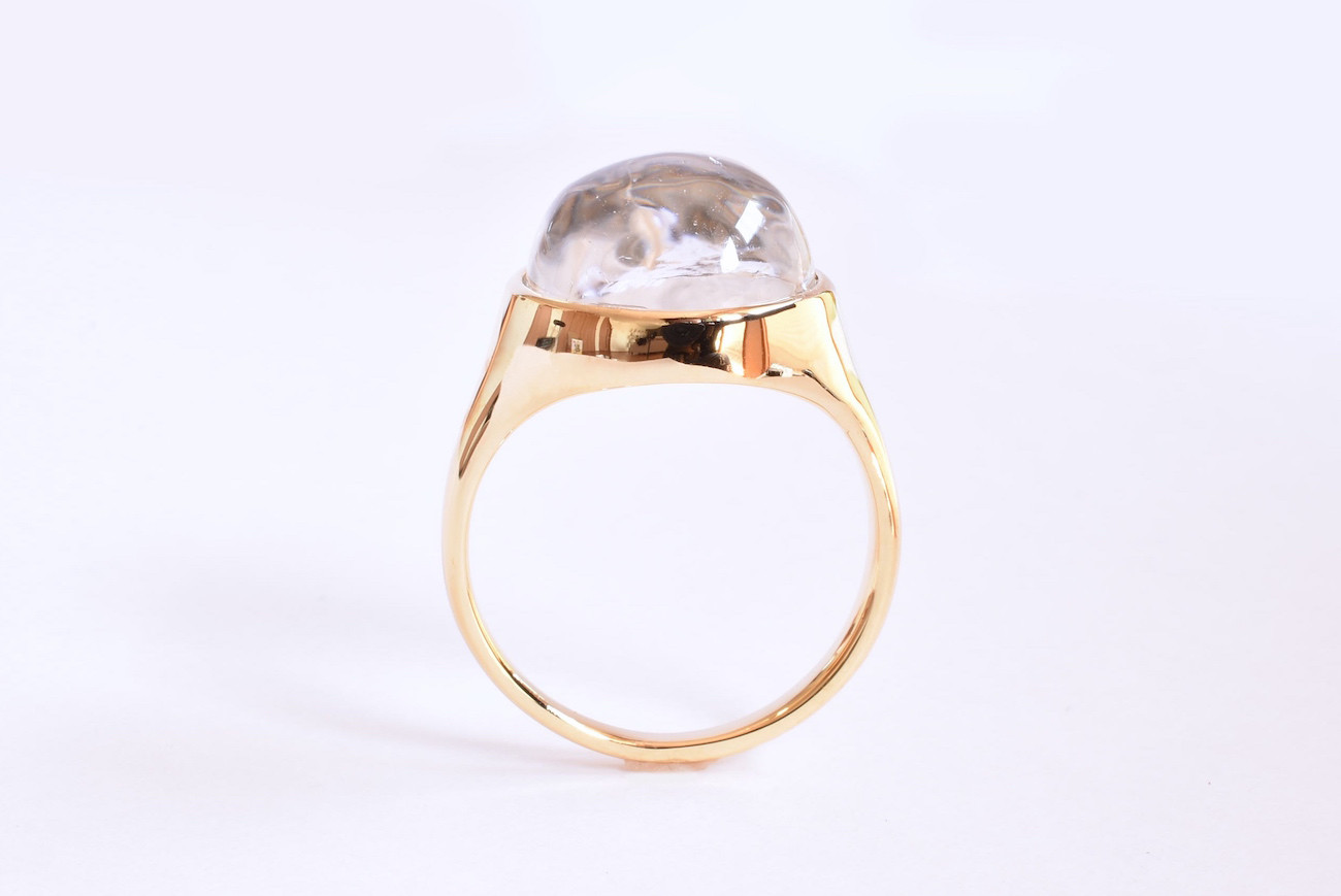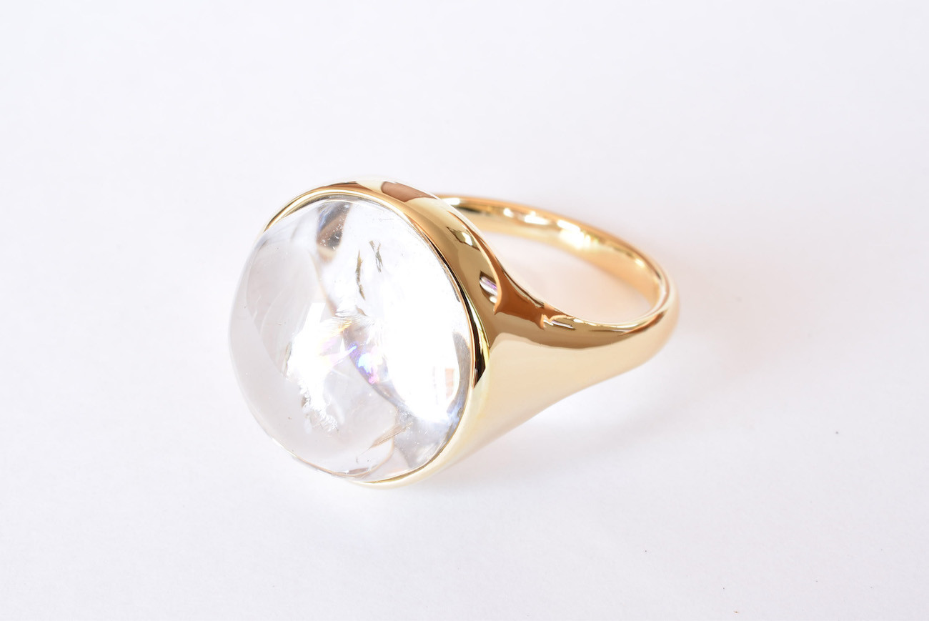 お客様からご支給頂いたアイリスクォーツを覆輪リングに加工させて頂きました。ただの覆輪ではなく、枠全体から徐々にリングになっていく様なデザインで、ありそうで無いカタチです。宝石にボリューム感があるので、ゴツくなりがちですが、リングのテーパードを細めにする事で女性らしさを演出しました。