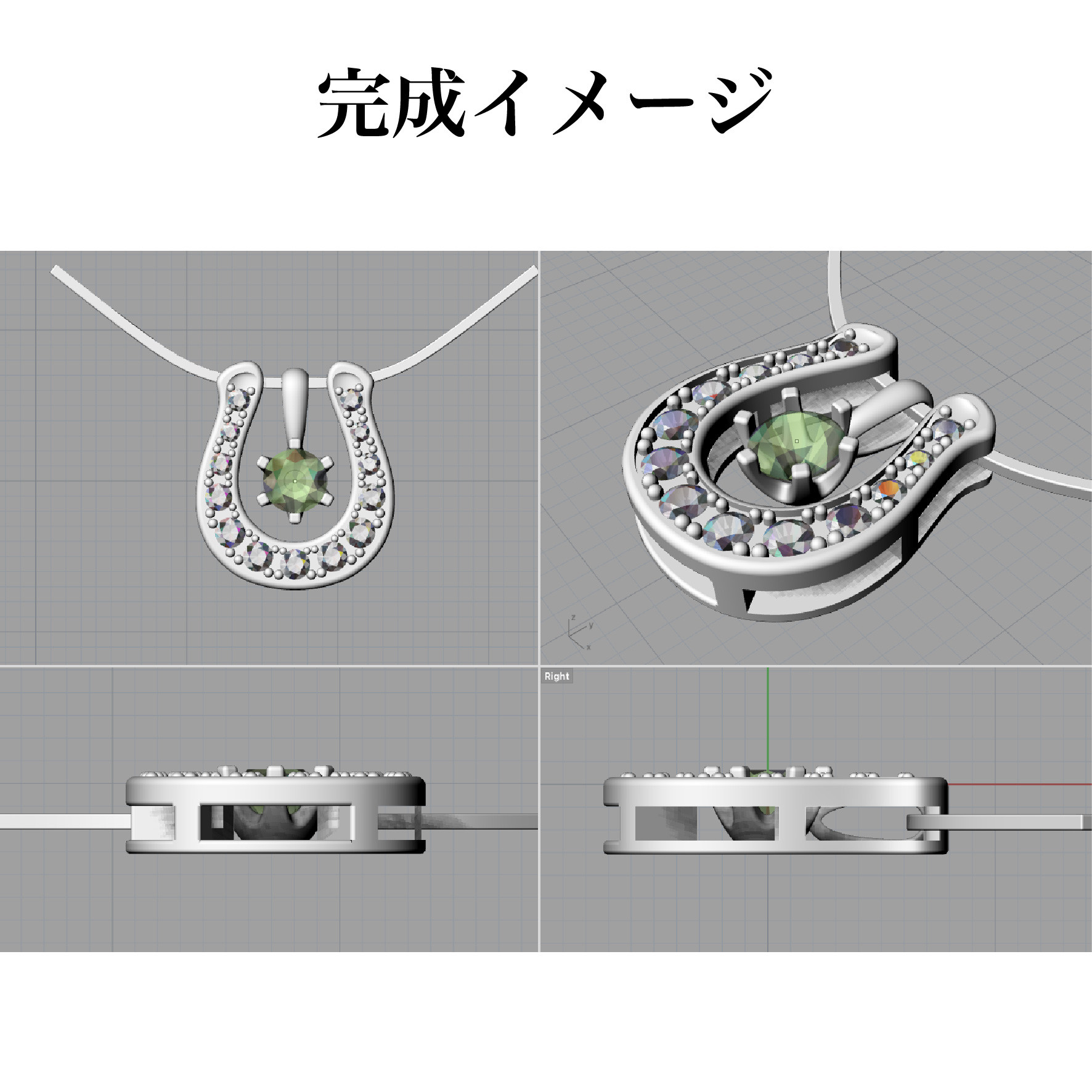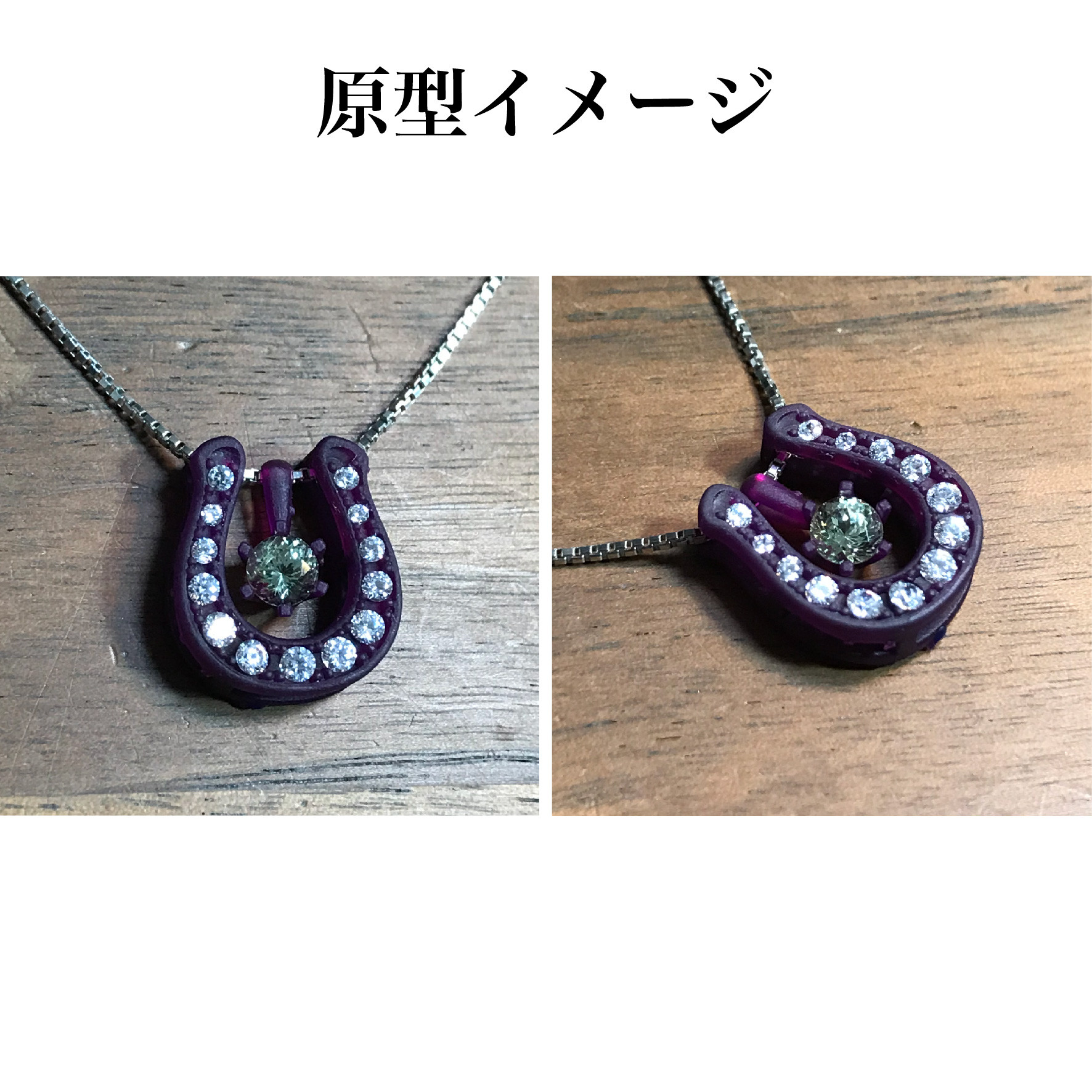 お客様からご支給頂いたライムガーネットを使い、宝石部分が着脱可能な馬蹄ペンダントを製作致しました。頂いたイメージ写真の真珠の大きさが直径7mmに対してライムガーネットの大きさが直径4mmだった為、その大きさに合った馬蹄の形状や構造をご提案させて頂きました。中央の宝石は付け替え可能なので色々な宝石と合わせてお楽しみ頂けます。