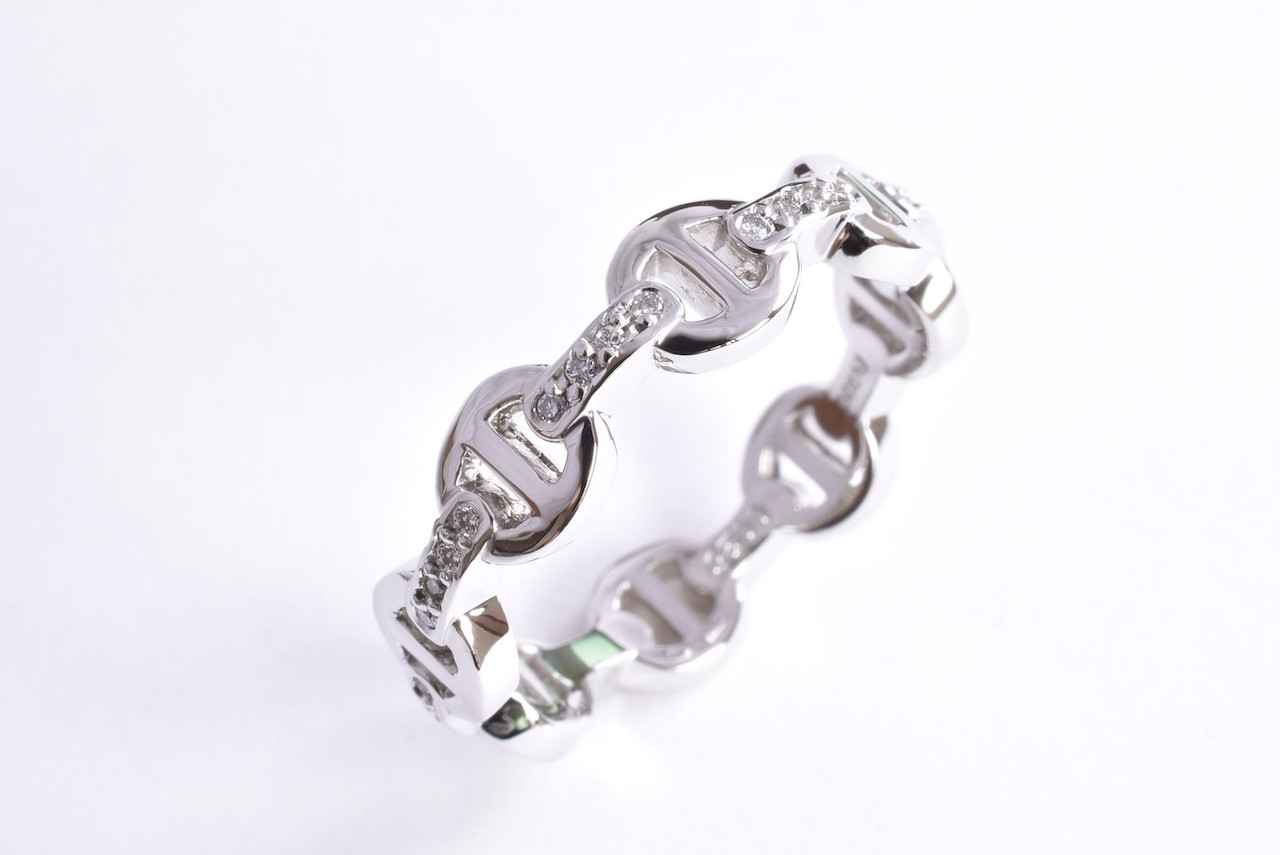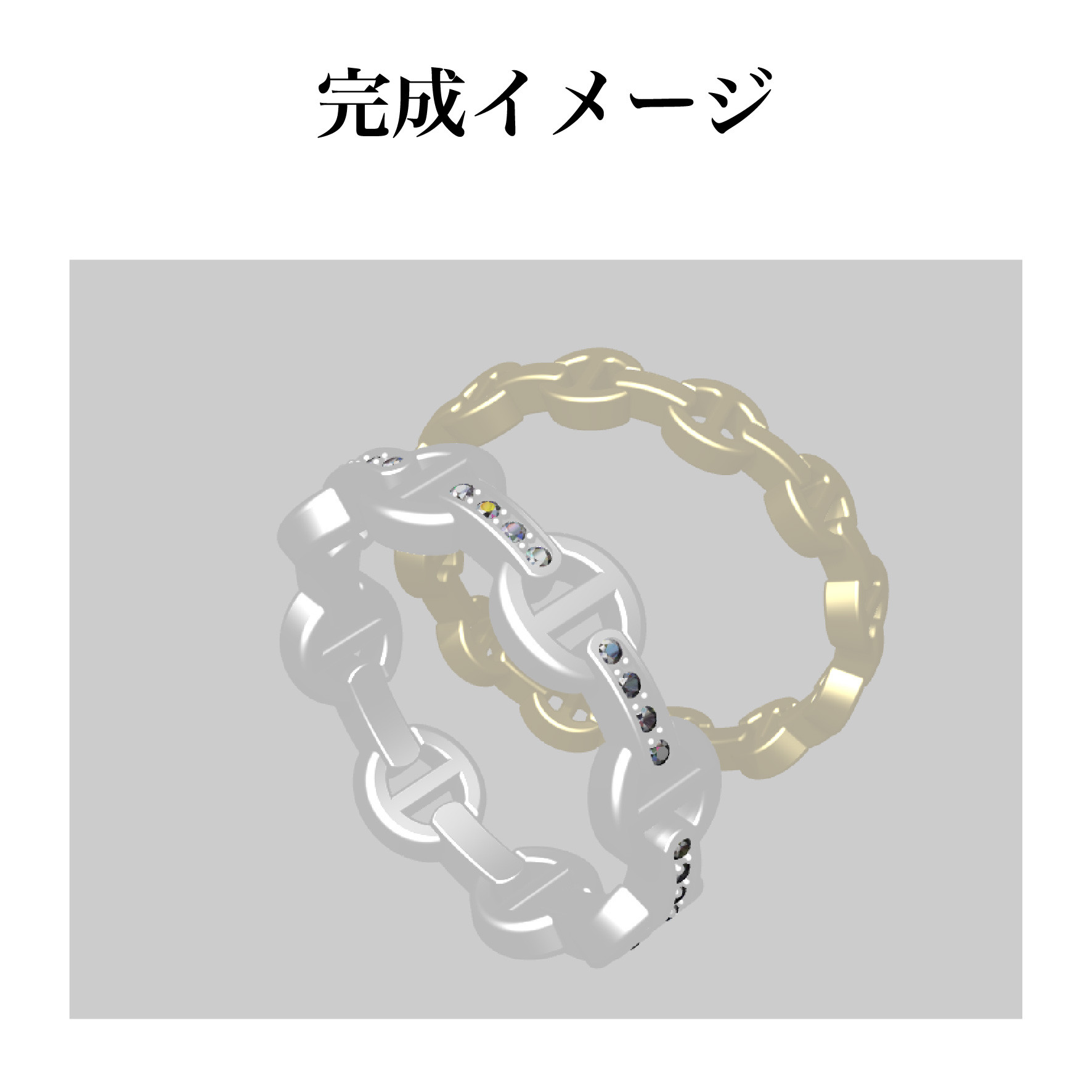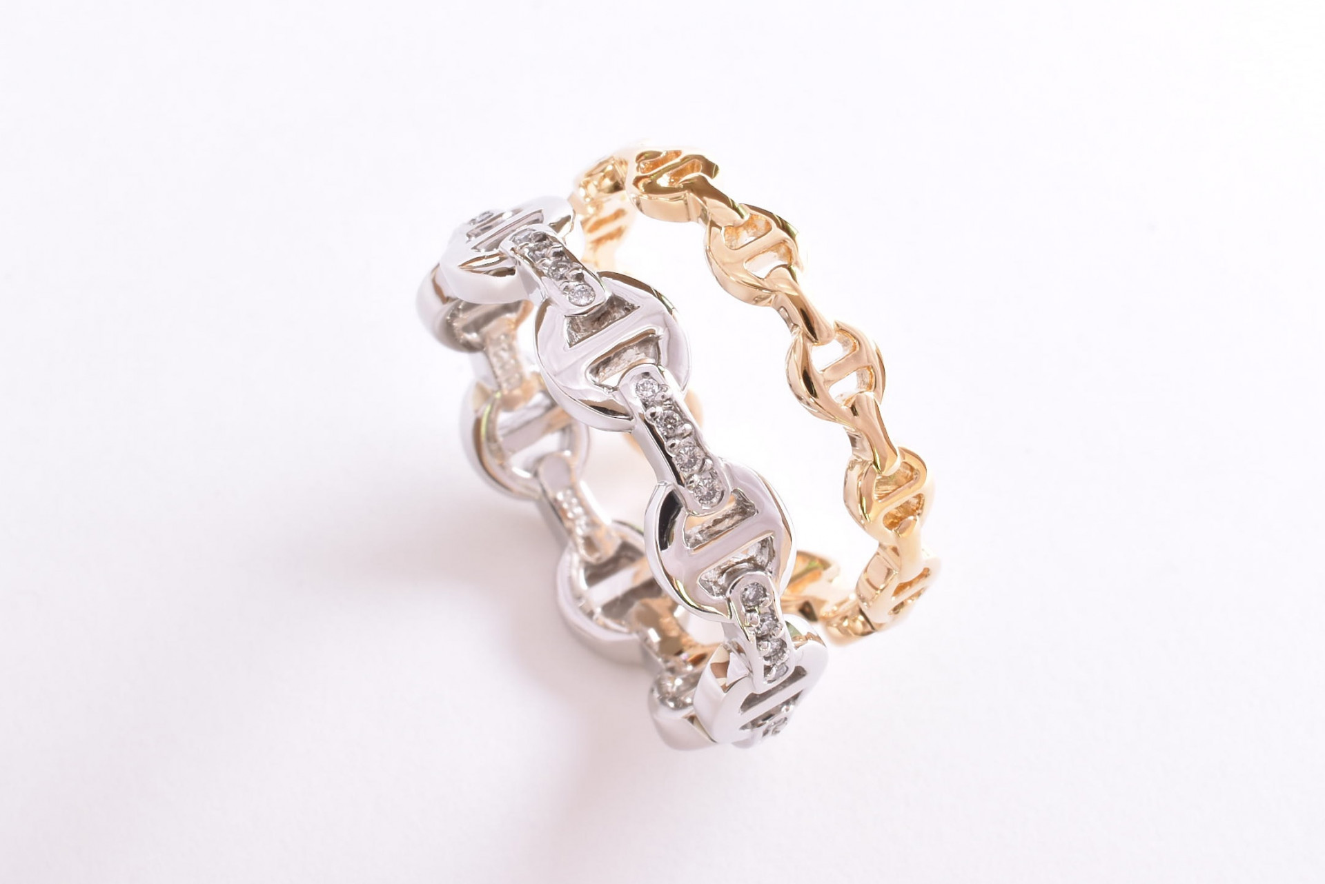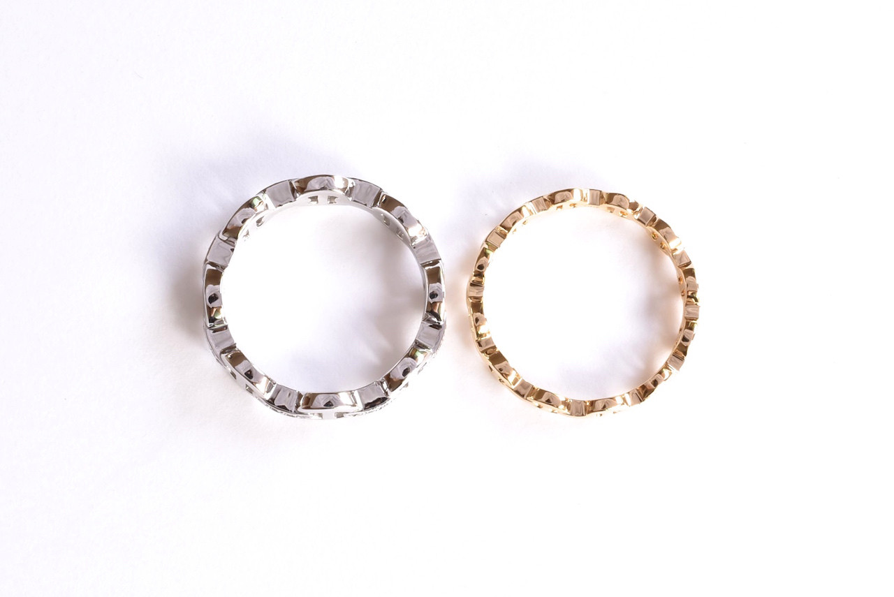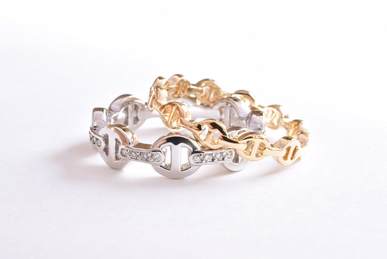 ダイヤモンド32石を贅沢にあしらったPT900製のチェーンリングとK18YG製の細身のチェーンリングです。頂いたイメージ写真を元に製作させて頂きました。チェーンのサイズや間隔で印象が大きく変わるので、お客様の指に合ったオリジナルのサイズ感で設計しました。